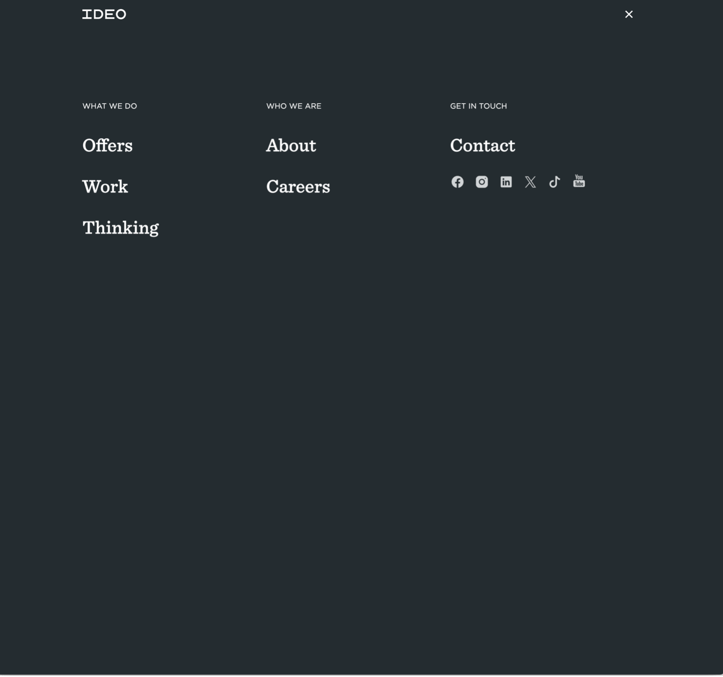 錯誤示例: Ideo 網站的漢堡選單覆蓋全屏,導致短暫的迷失感。