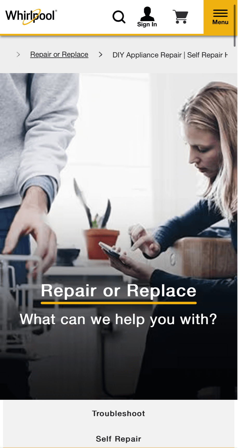 正確示例: Whirlpool 網站透過麵包屑導航幫助使用者快速定位當前位置。