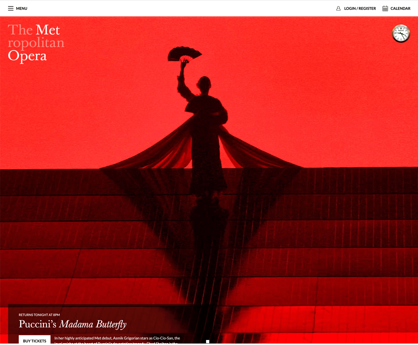 錯誤示例: 大都會歌劇院網站在桌面端使用漢堡選單,雖然頁面有足夠的空間,但隱藏的導航難以引起使用者注意。