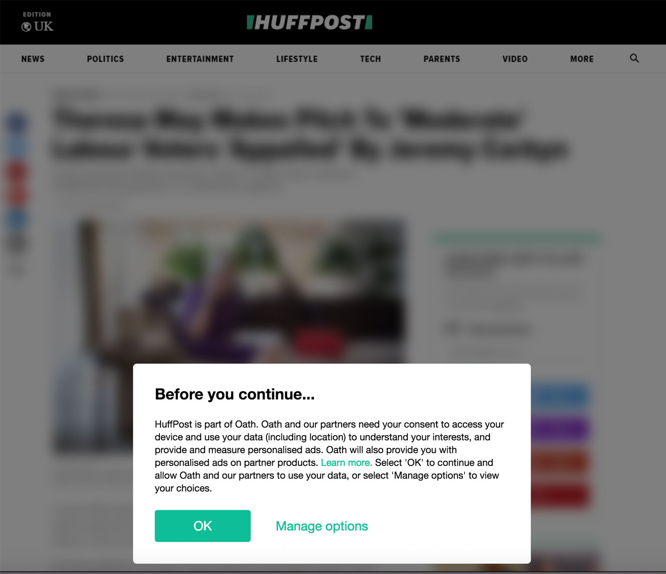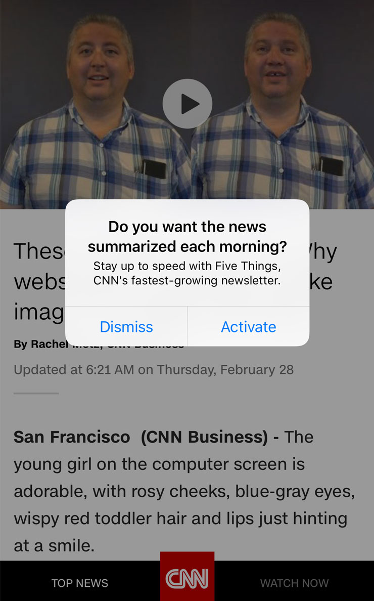 當使用者剛載入一篇文章或長篇內容時彈出模態對話方塊會使使用者感到不適。這種行為讓使用者覺得必須先滿足一些條件才能閱讀內容,破壞了網站的可信度。一個例子是,CNN在使用者點選進入文章後立即彈出訂閱彈窗,導致使用者對網站的意圖產生懷疑。