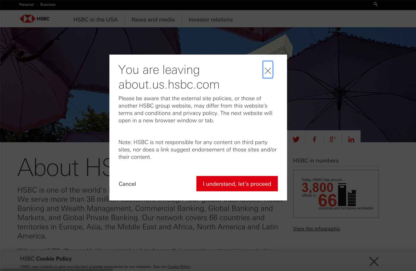 一些企業網站在使用者準備從主站點跳轉到子域或外部網站前會彈出模態視窗,提示使用者即將離開當前頁面。然而,這種提醒往往會引起使用者的迷惑和不適,尤其是在新標籤頁開啟子站點時,使用者可能感到迷失方向。