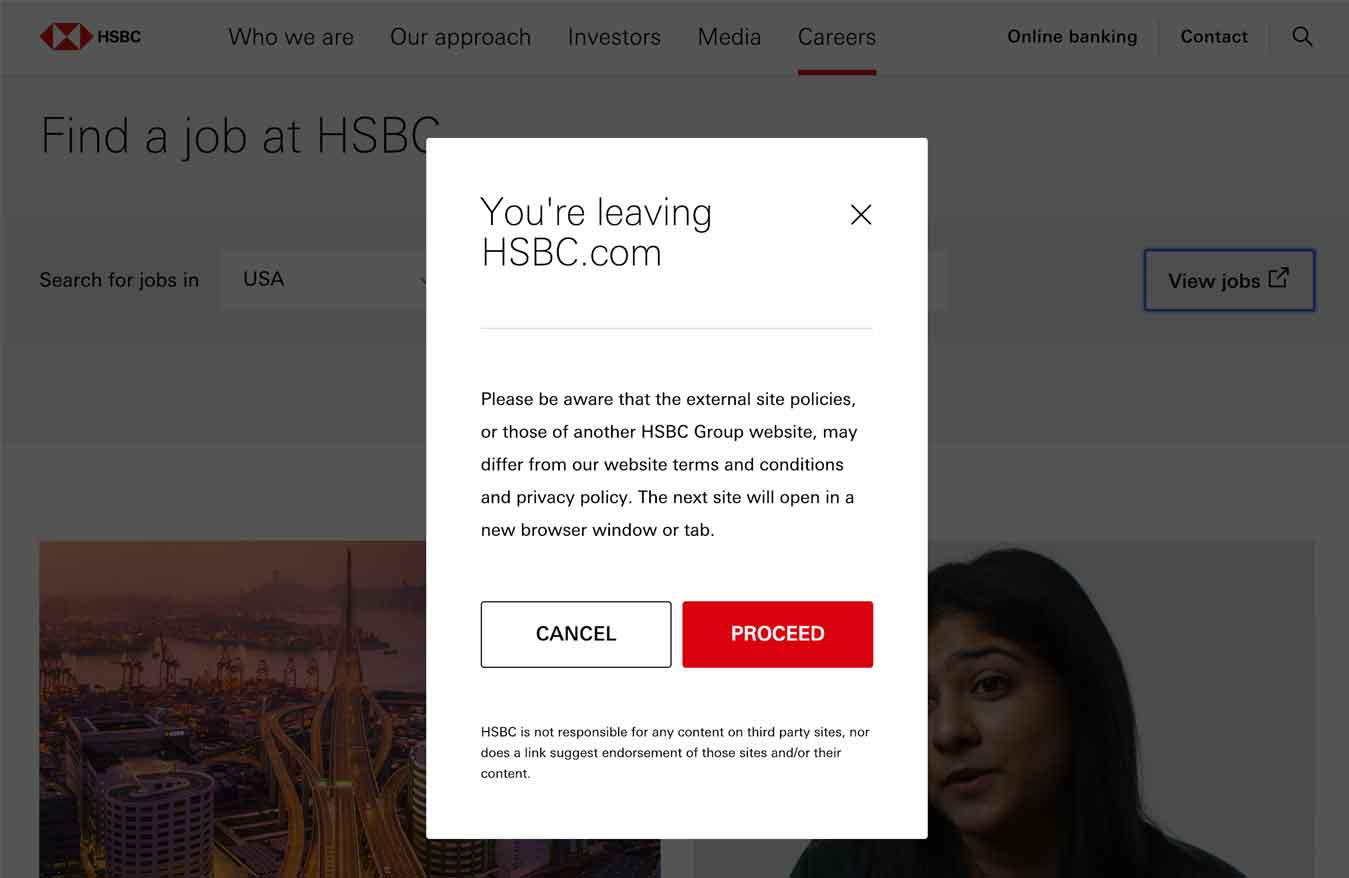 使用者測試示例:在HSBC的招聘網站上,使用者在不同網站之間跳轉時遇到了多層模態彈窗。他表示,這一複雜的流程讓他對公司的申請流程產生負面印象。