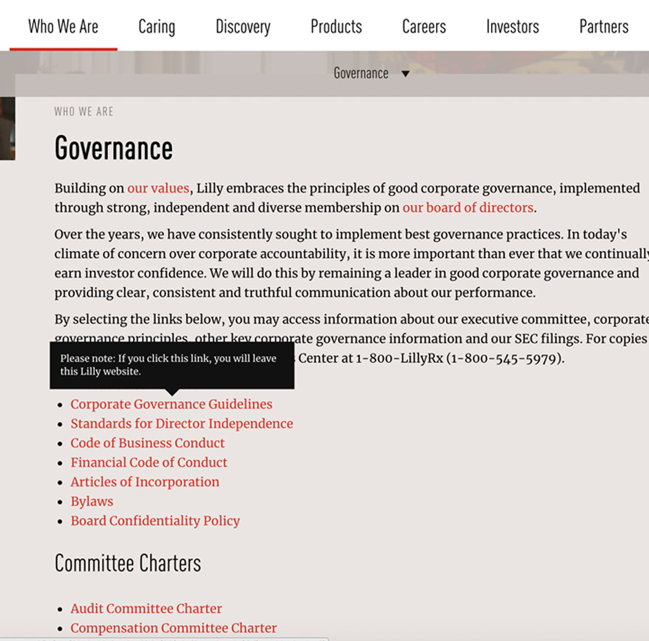Eli Lilly使用資訊提示來告知使用者即將前往其他站點,幫助使用者記住頁面路徑。