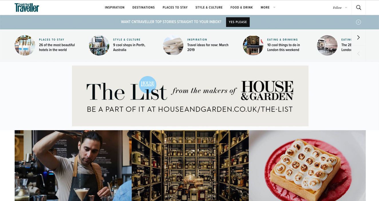 Conde Nast Traveller網站在導航下方使用非侵入性的可關閉橫幅,給有興趣的使用者提供訂閱選項,而不幹擾其他使用者的瀏覽體驗。