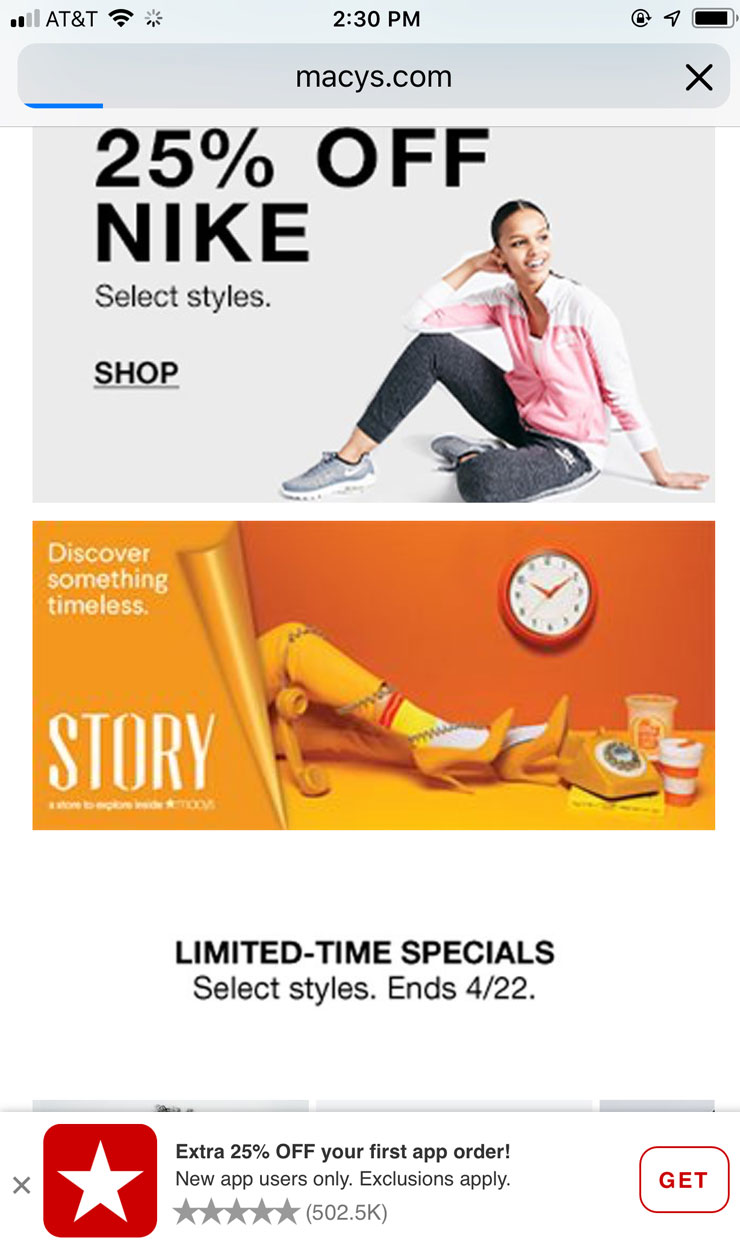 Macy’s使用頁面底部的非模態彈窗,鼓勵使用者下載移動應用,並透過使用者評分顯示應用的受歡迎程度,同時不會打擾使用者當前的任務。