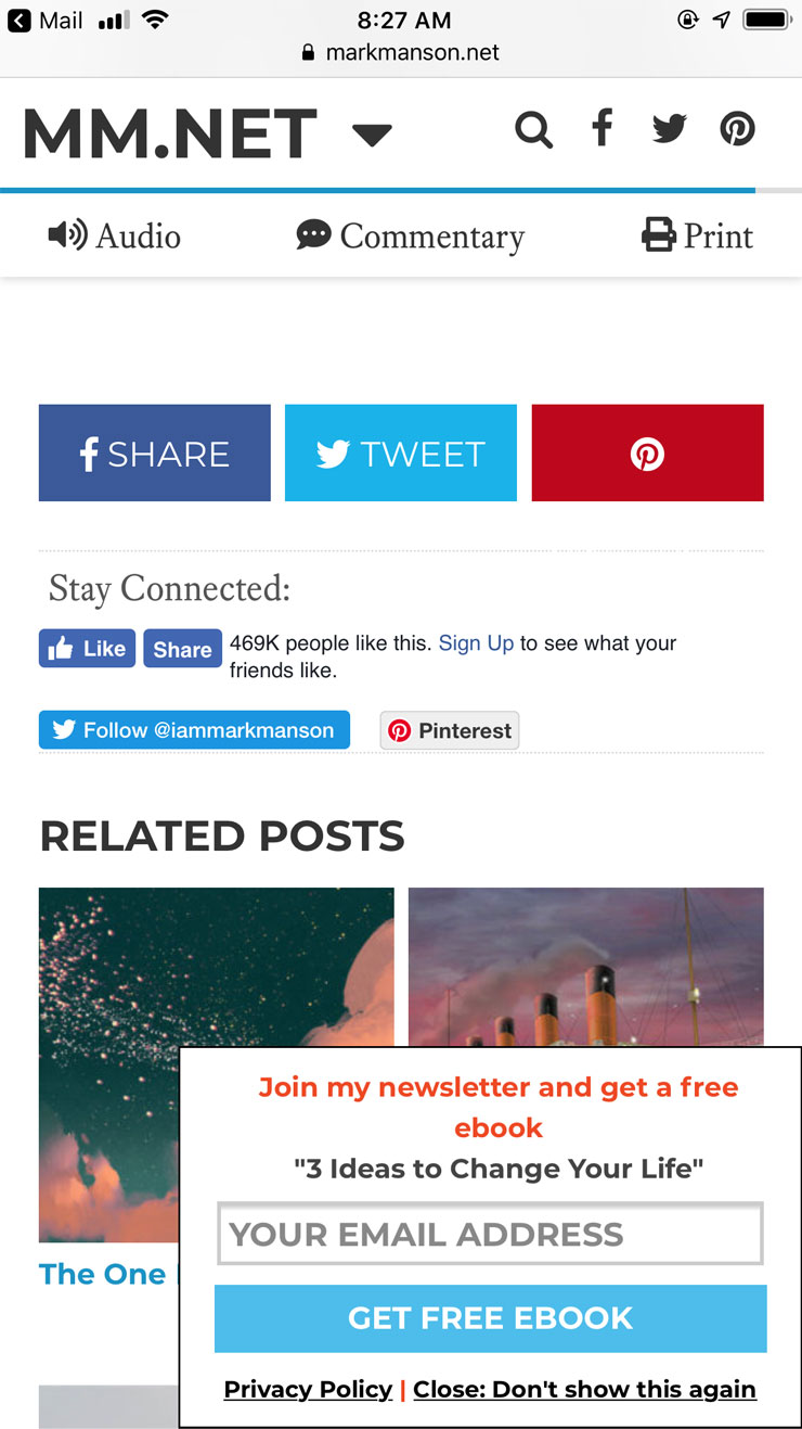 在使用者與網站內容進行互動前請求其提供郵箱地址(常見於電商、新聞網站或部落格)會令人反感,尤其使用者會懷疑此舉可能帶來垃圾郵件。過早彈出的郵箱請求通常只會激怒使用者,造成負面印象。