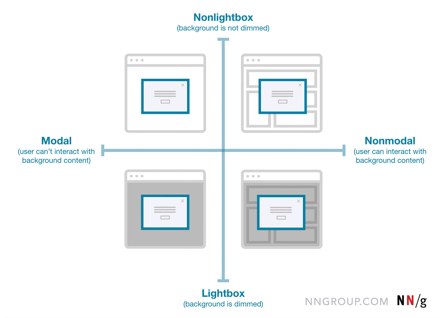 - 模態(Modal):使用者必須與彈窗互動,背景內容被禁用。