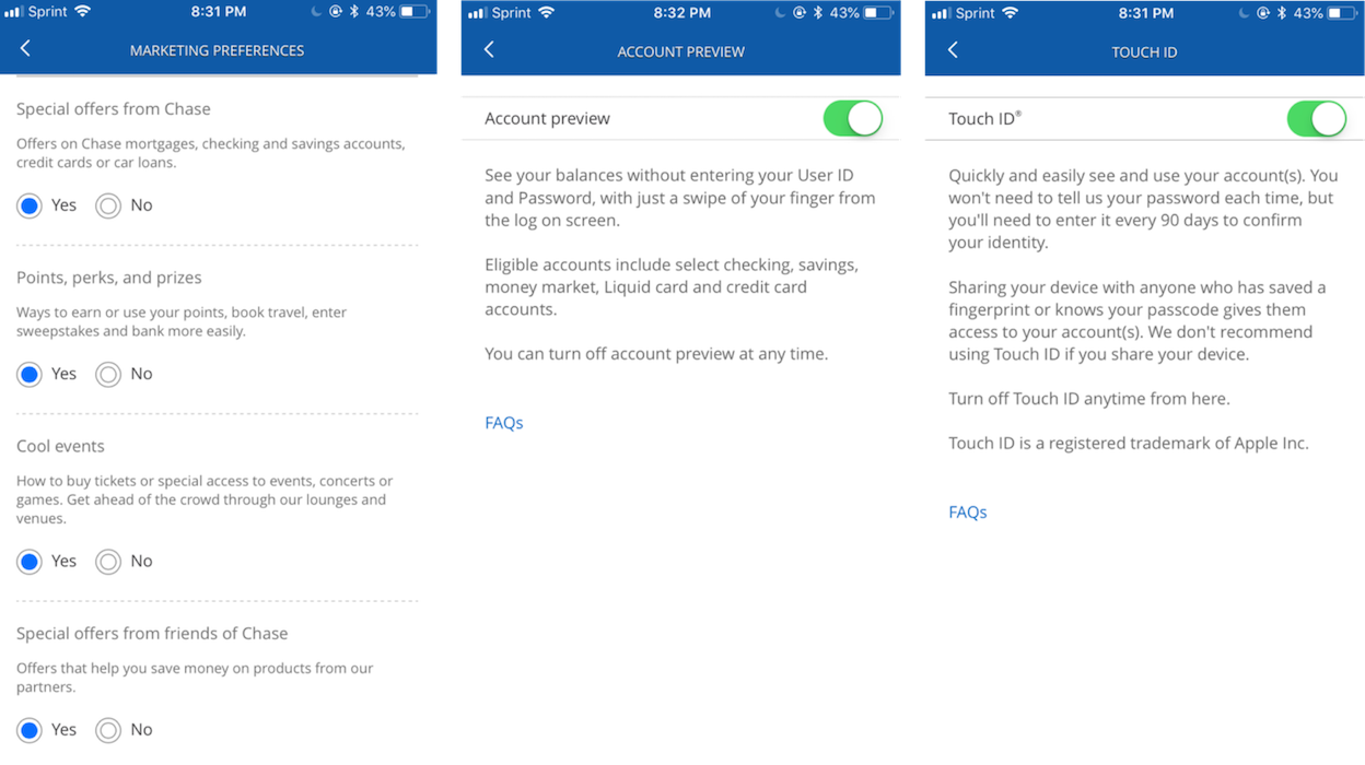 錯誤示例:Chase Bank iOS應用在不同頁面中混用切換開關和單選按鈕,使用者難以預測控制元件的行為。