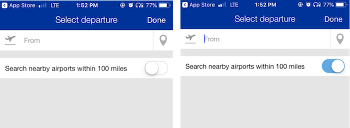 錯誤示例:United Airlines iOS應用中的切換開關,使用者點選後沒有即時結果,導致疑惑。此場景更適合使用核取方塊。