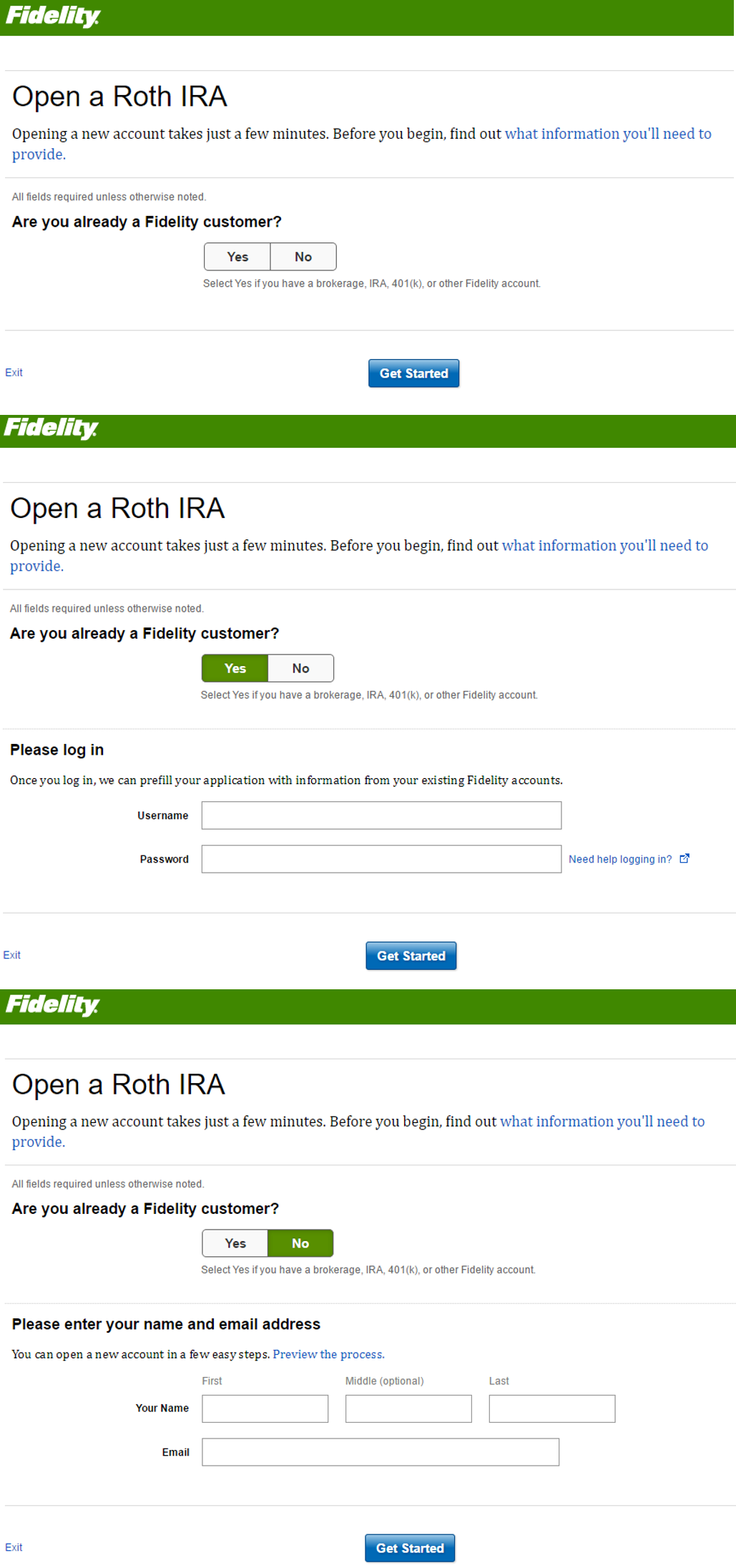 Fidelity的頁面詢問使用者是否是現有客戶,根據使用者回答動態展示不同的輸入欄位。這種根據使用者輸入變化的頁面更接近嚮導。