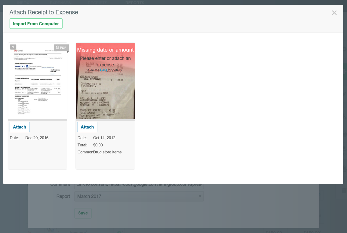 6 確保步驟資訊獨立完整:每一步驟需包含完成任務所需的全部資訊,不應依賴其他部分的資訊。Expensify.com:當使用者試圖將收據新增到費用中時,嚮導遮蔽了費用詳細資訊。使用者必須記住她正在輸入的是哪項費用以及是為哪個供應商輸入的,以便能夠識別該費用的收據。