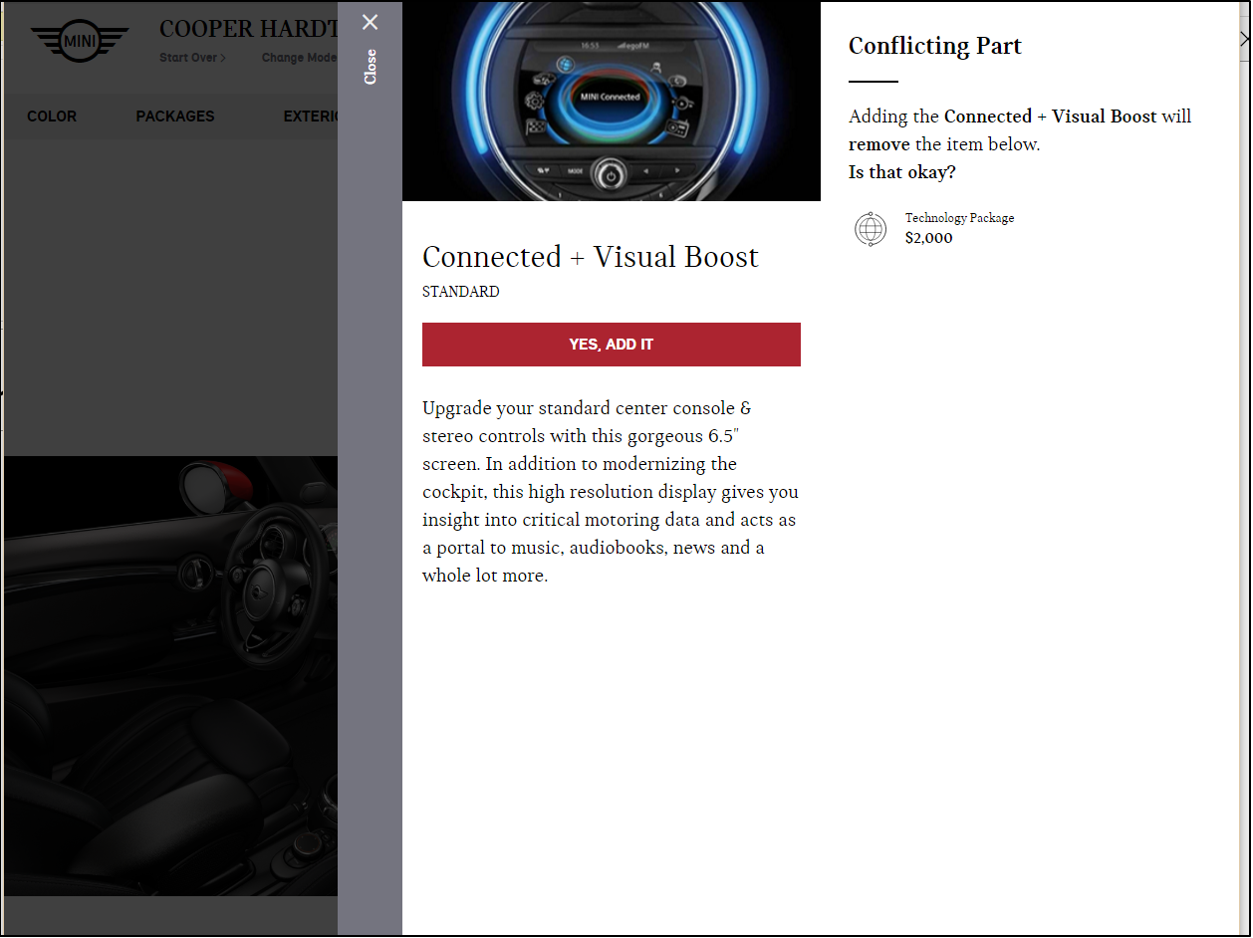 7 輔助資訊展示:解釋內容和幫助資訊應顯示在嚮導旁邊,而非覆蓋主要內容。例如,Miniusa.com的選項說明彈窗遮擋了背景內容,難以檢視選項上下文資訊。