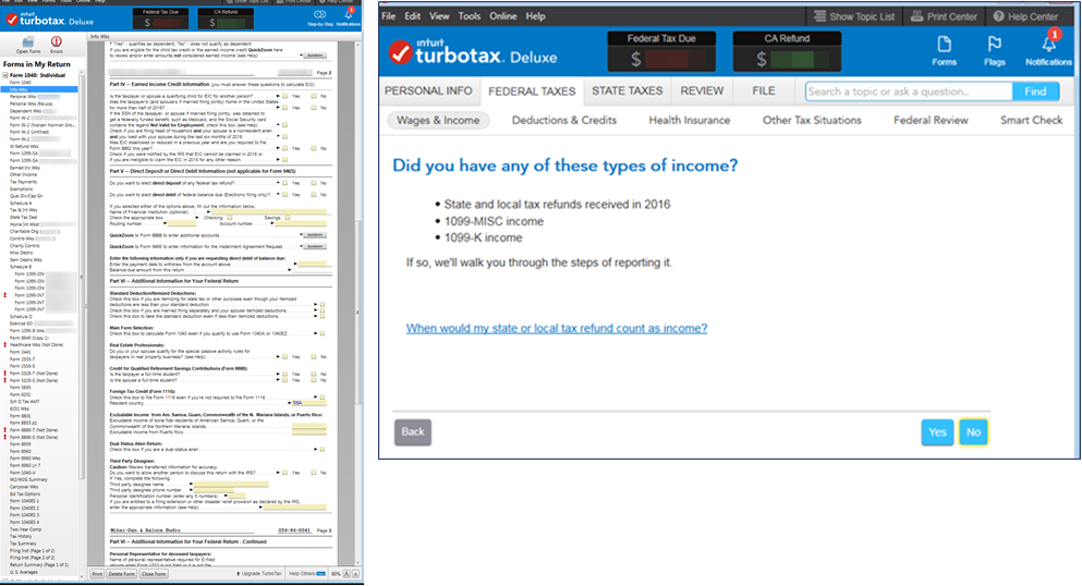 案例:Turbotax紙質稅表(左圖)在數字化後成為電子表單。嚮導(右圖)將填寫流程分解為多個步驟,逐步引導使用者完成稅務申報。