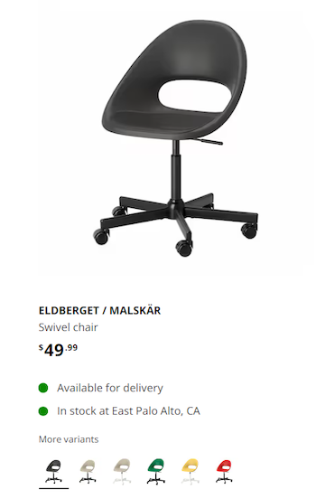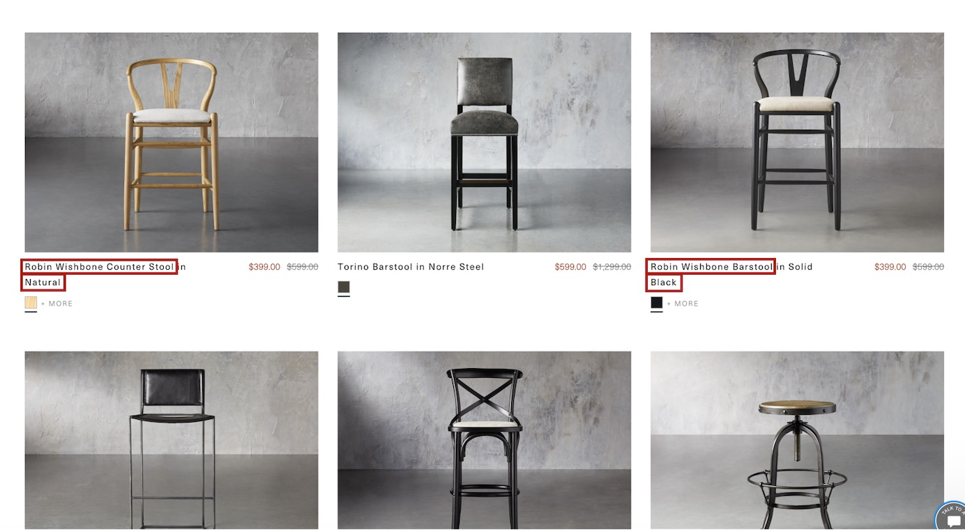 問題描述:相同款式的椅子因框架顏色和高度的不同被分為多個獨立產品頁。使用者在瀏覽頁面時,誤以為椅子只有一種顏色(Stone Vintage)和一種高度(Counter Stool)。