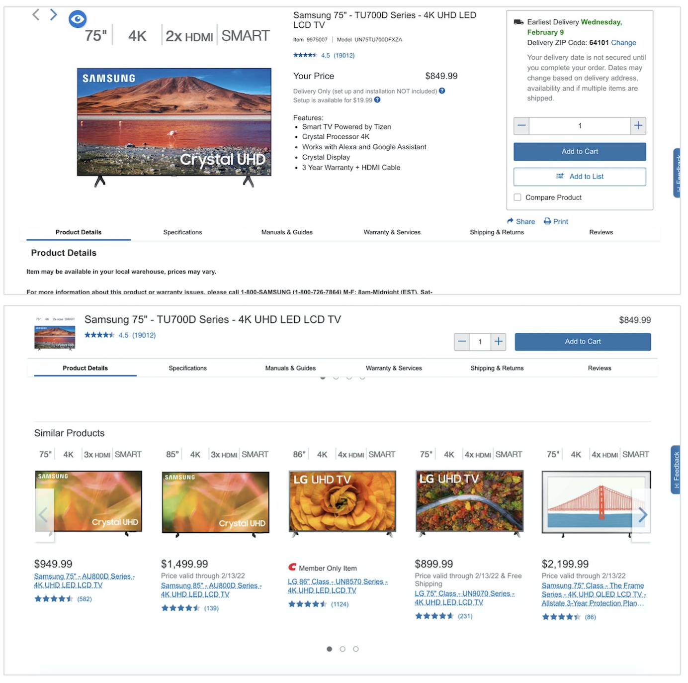 複雜變體展示不足:如 Best Buy 的電視系列使用下拉選單,資訊不足導致使用者需額外搜尋。