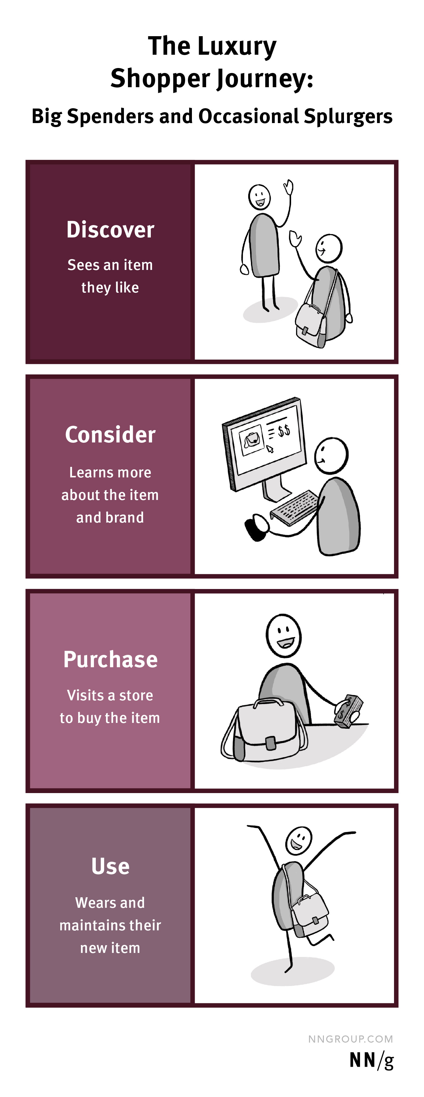 奢侈品購物旅程分為四個階段:發現(Discover)、考慮(Consider)、購買(Purchase)和使用(Use)。以下是具體階段及差異分析: