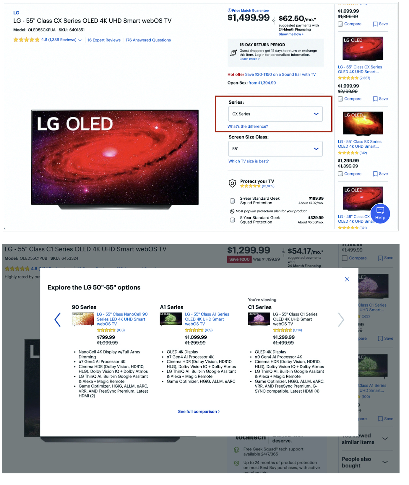 在研究中,我們發現一些網站將完全不同的商品視為同一商品的變體,放在同一頁面。例如,Best Buy網站的電視頁面透過下拉選單展示“系列”這一屬性,但每個系列實際上對應不同型號和功能的電視。