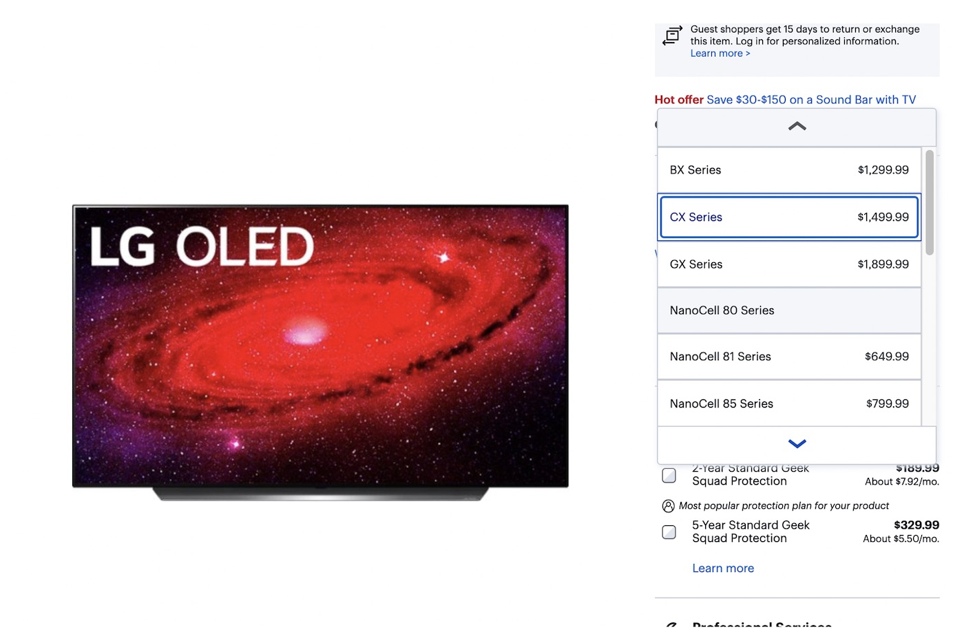 將不同系列的電視設為獨立商品頁面,而不是透過下拉選單選擇。其他相關型號可以透過“類似商品”模組展示。例如,Costco網站將每個系列分開展示,並在頁面下方推薦相關商品。