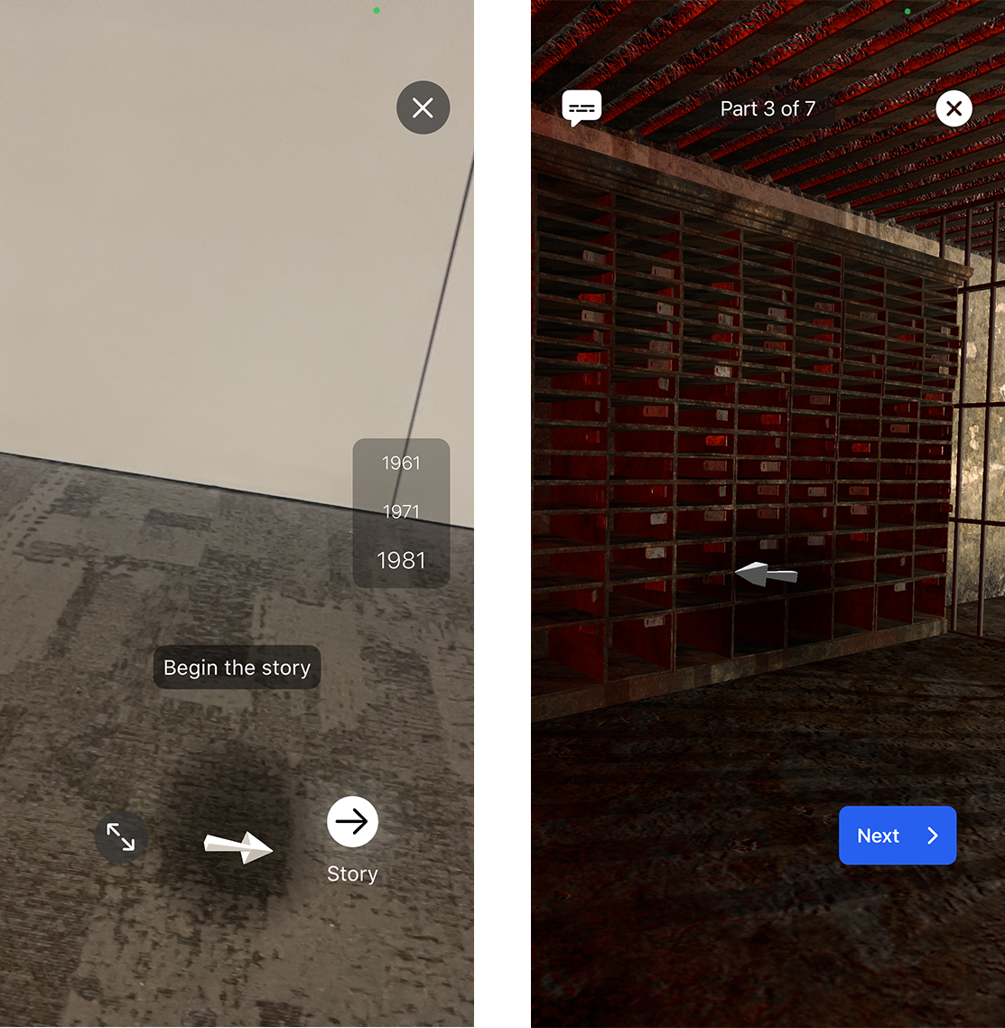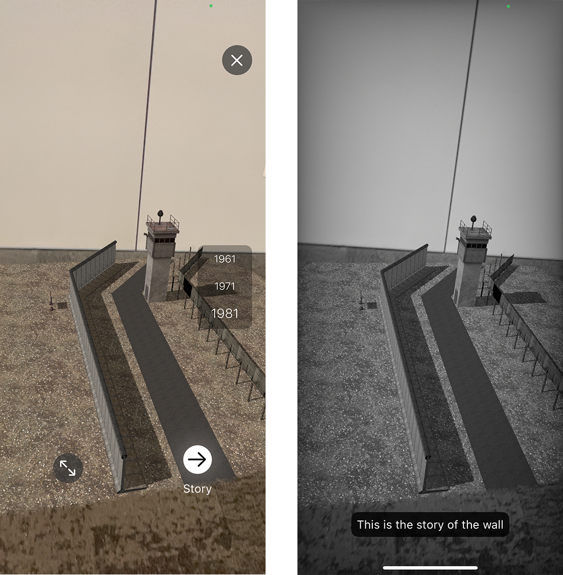 MauAR 柏林牆應用程式為敘述性文字(右)使用了黑色對比背景。然而,諸如標籤“故事”和年份(1961、1971、1981)(左)之類的使用者介面副本也會受益於黑色對比背景。