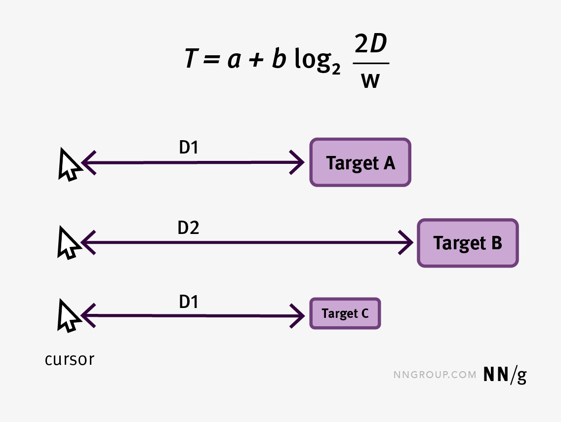 菲茨定律公式描述了指標(如滑鼠、手指或手)的移動時間與目標的大小和距離之間的關係: