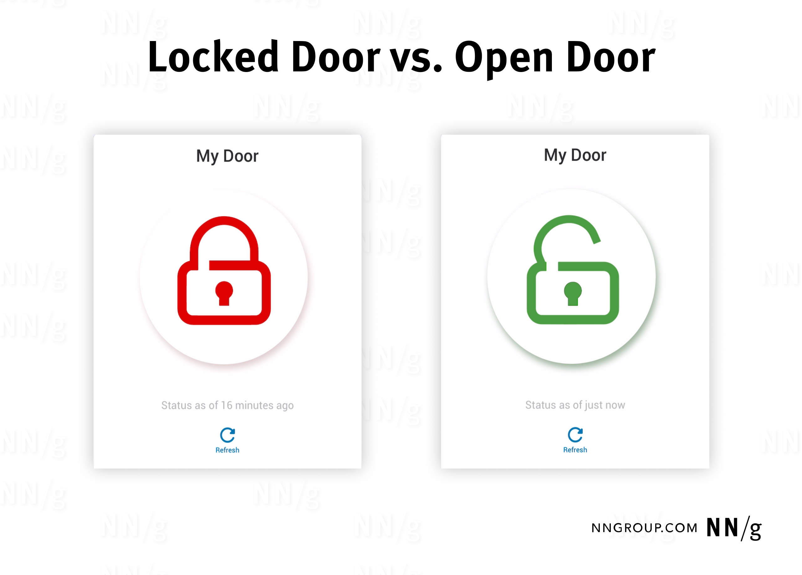這款智慧鎖 App 用了兩種方式來顯示門的狀態:顏色(紅色代表沒鎖,綠色代表已鎖)和圖示(開鎖和關鎖的圖案)。使用者一眼就能看出門是開著還是鎖著的。如果再加上"已上鎖"和"未上鎖"這樣的文字,就更清楚了。