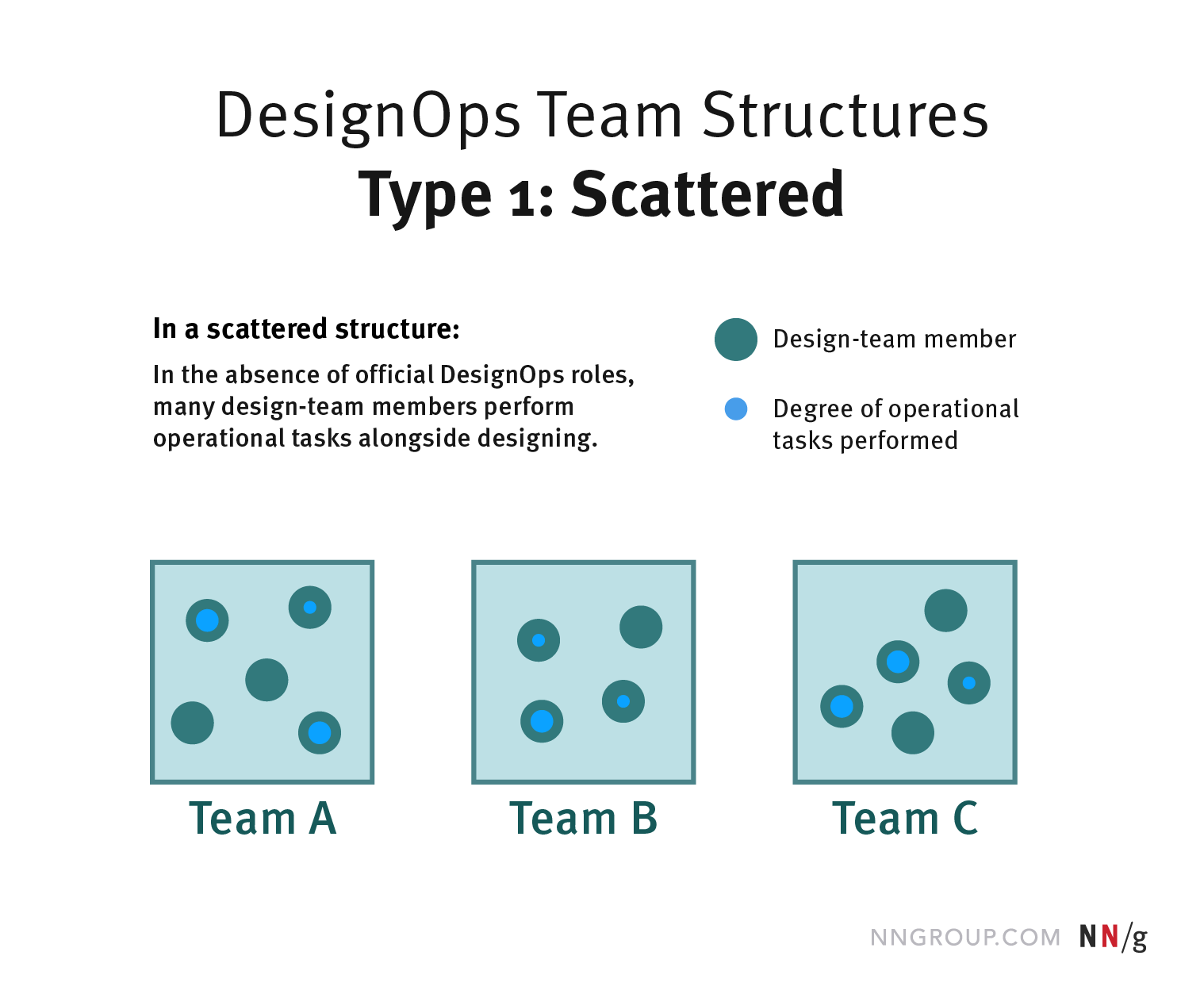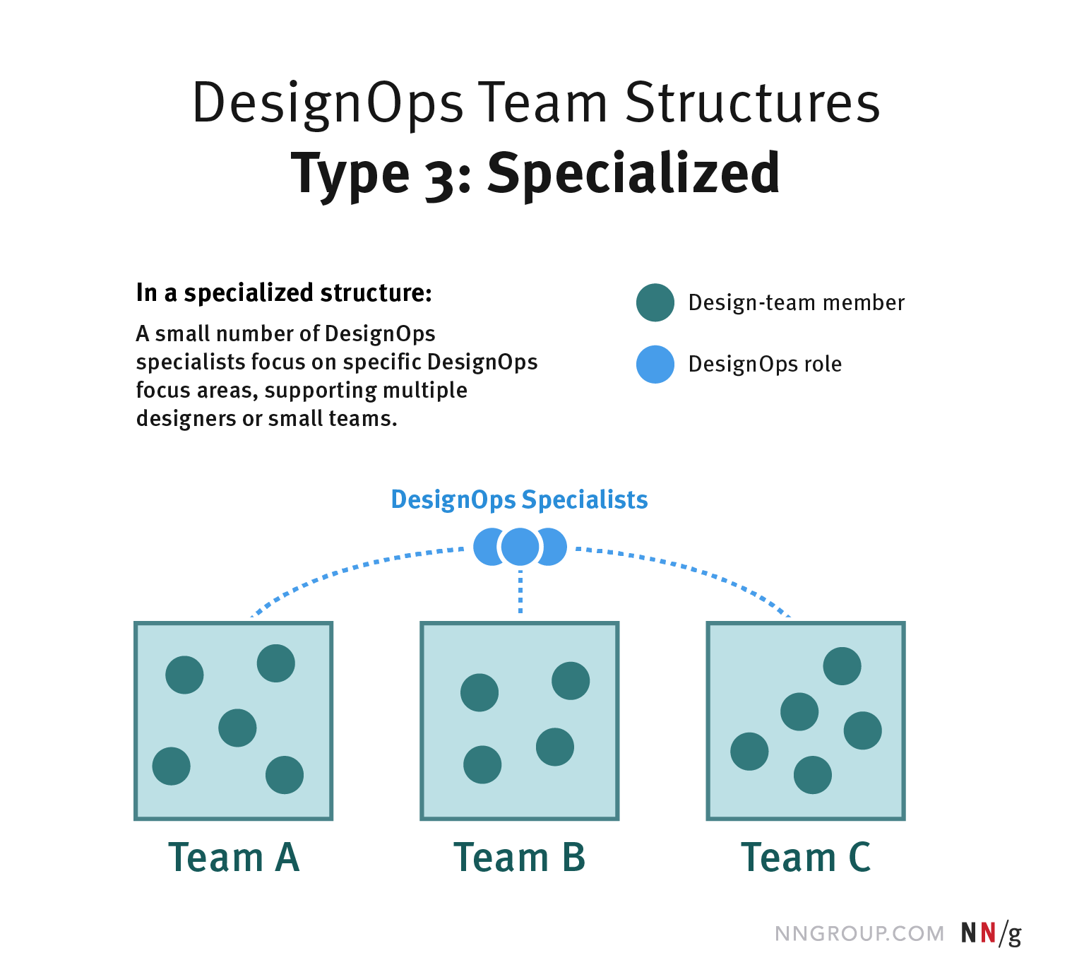 定義:多個全職 DesignOps 角色分工明確,每人專注於某一特定領域。