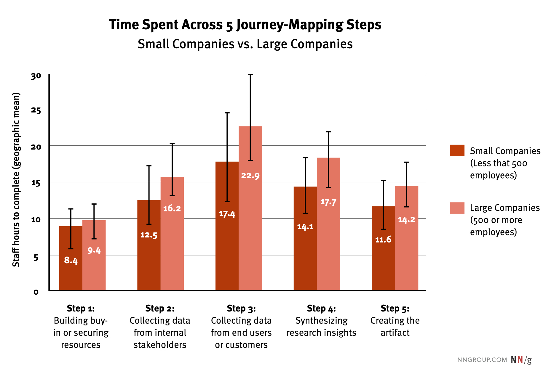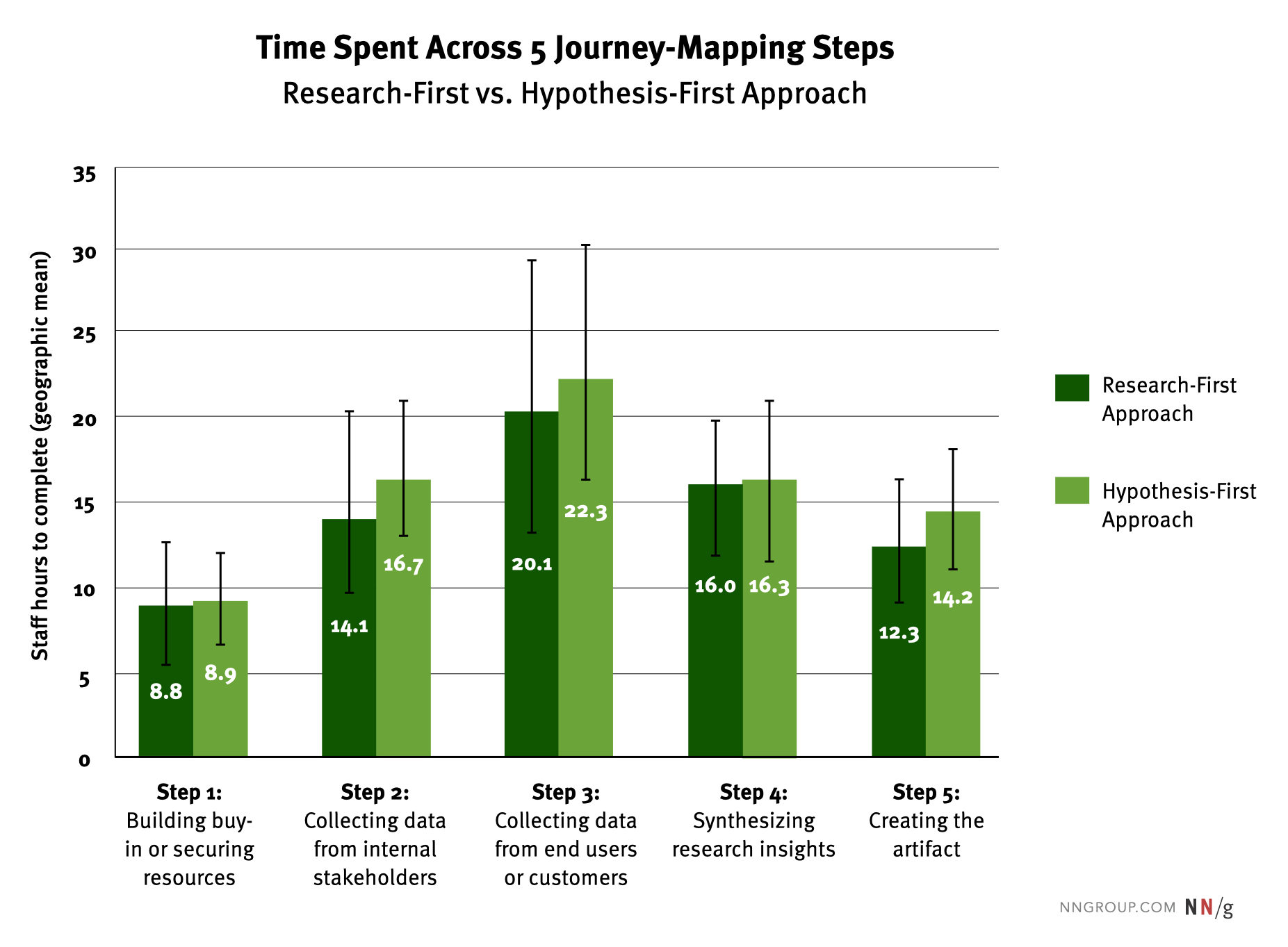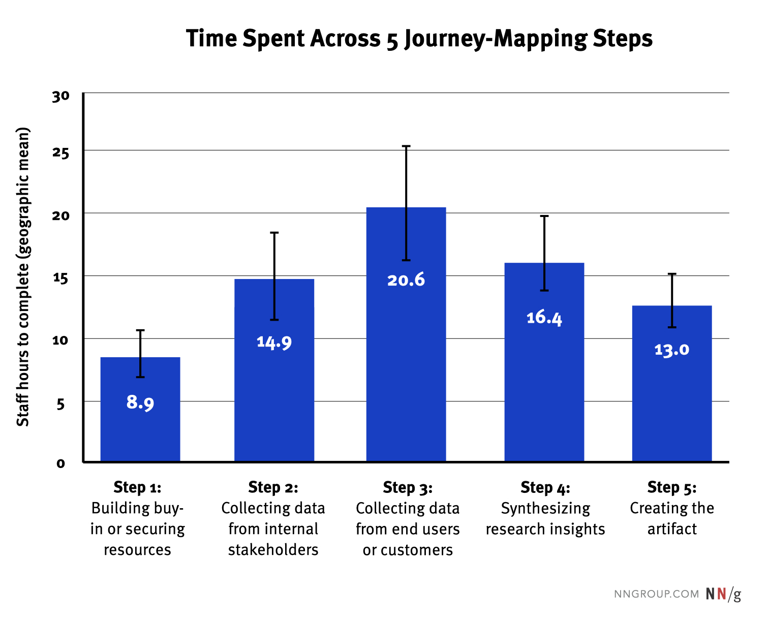 調查中,實踐者報告了在旅程地圖專案的五個關鍵階段中所花費的時間: