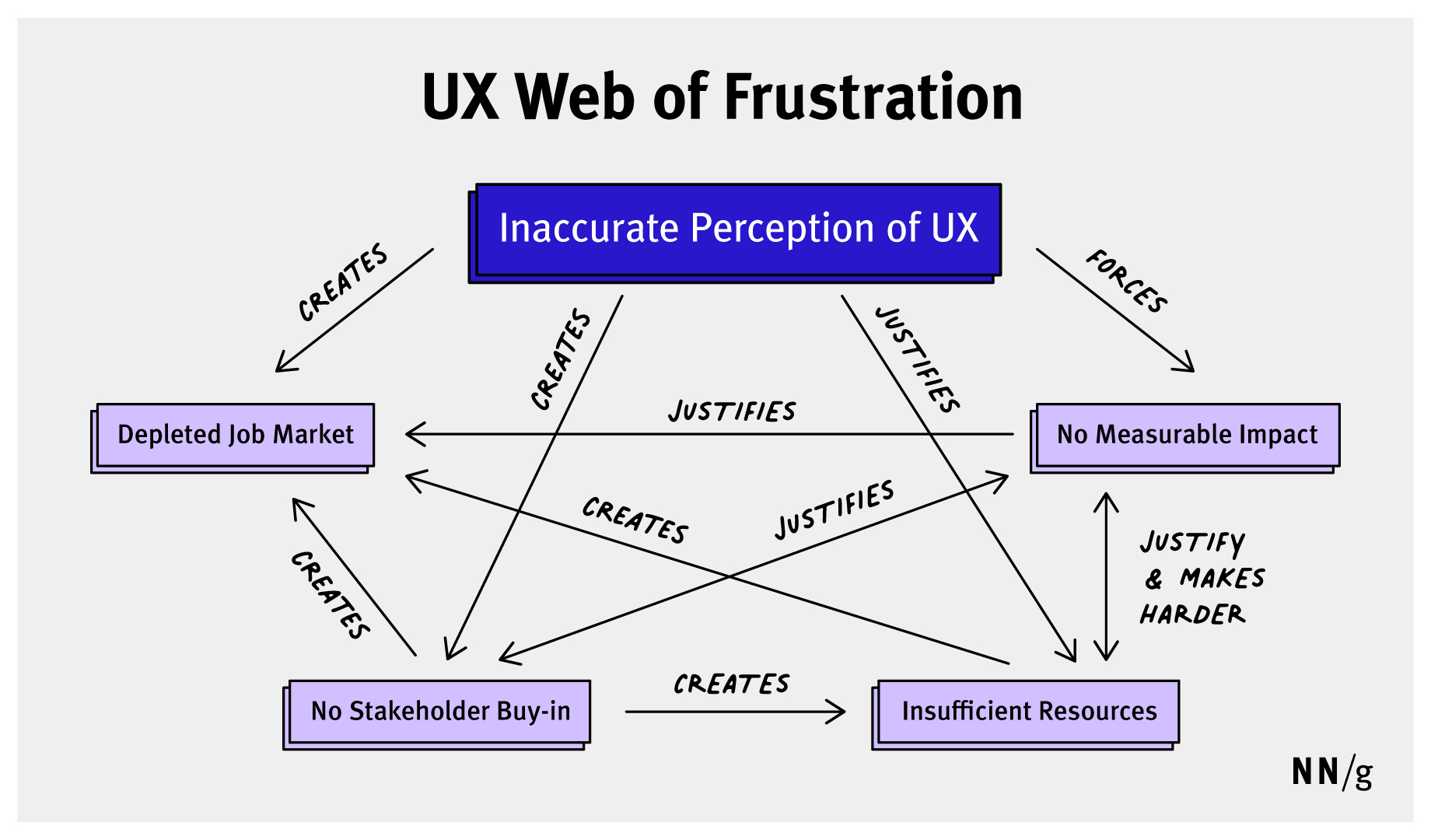 現狀:很多組織將UX錯誤地等同於視覺設計或美學設計,而忽視了它對業務功能和使用者轉化的實際影響。這種誤解讓UX被視為“可有可無”,導致其在預算削減或優先順序調整時首當其衝。