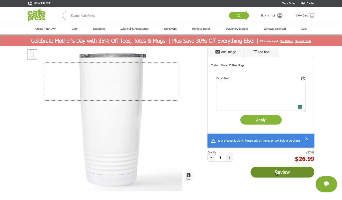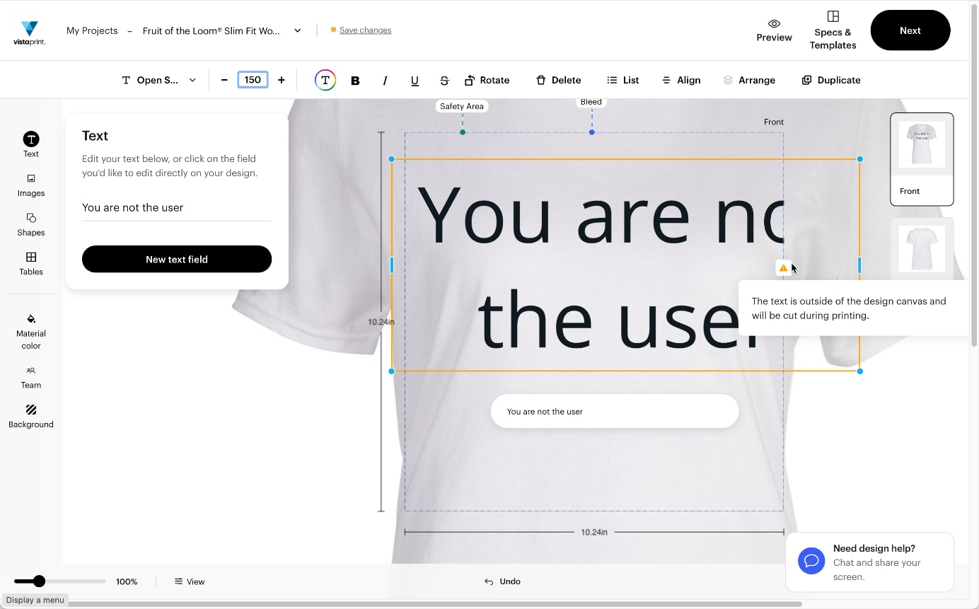 Vistaprint 傳達了放置在定製襯衫的可列印區域之外的文字將發生的情況。