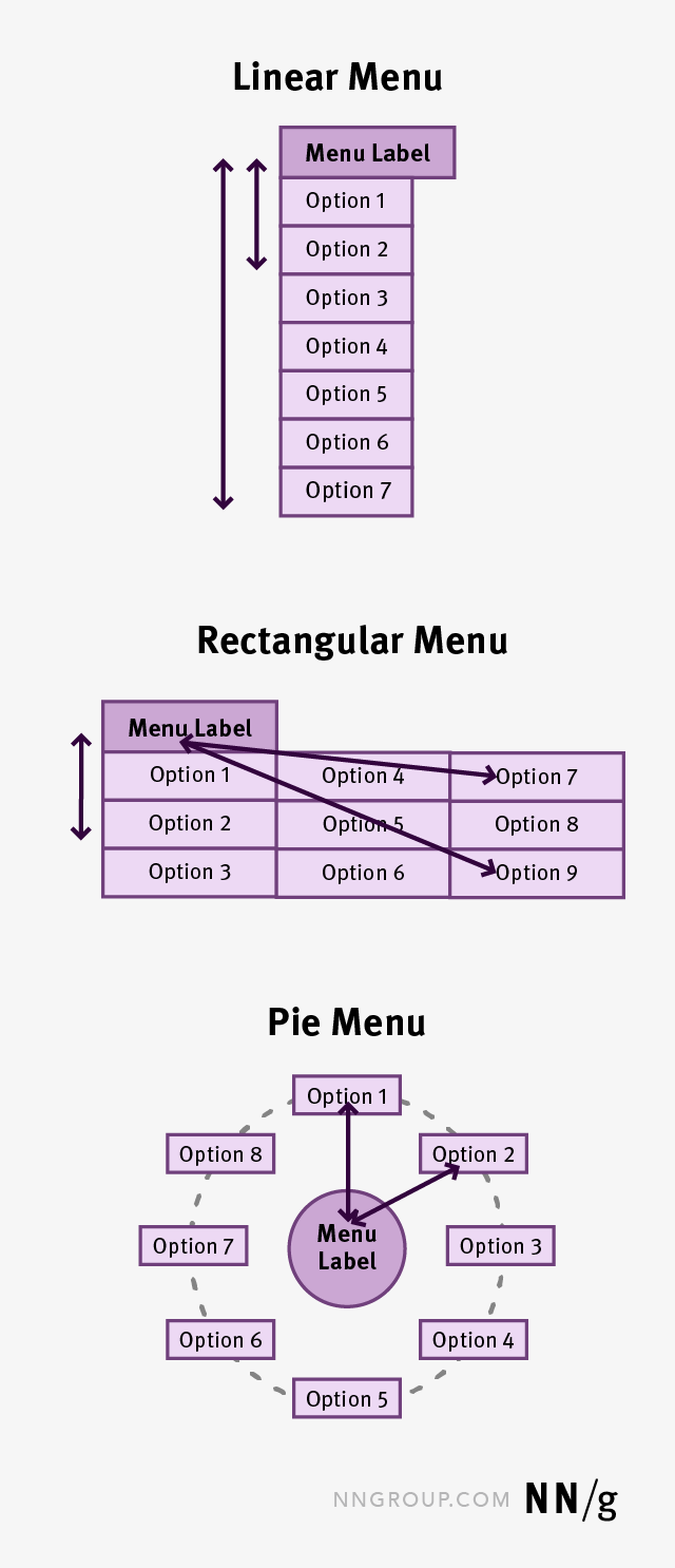 選單設計:選單項的排列方式影響移動時間。線性選單(如從上到下排列)會使遠端選項更難點選;矩形選單(Mega Menu)則可以同時利用水平和垂直空間,減少平均距離。圓形選單(Pie Menu)則讓每個選項到中心點的距離相等,提升了整體效率。
