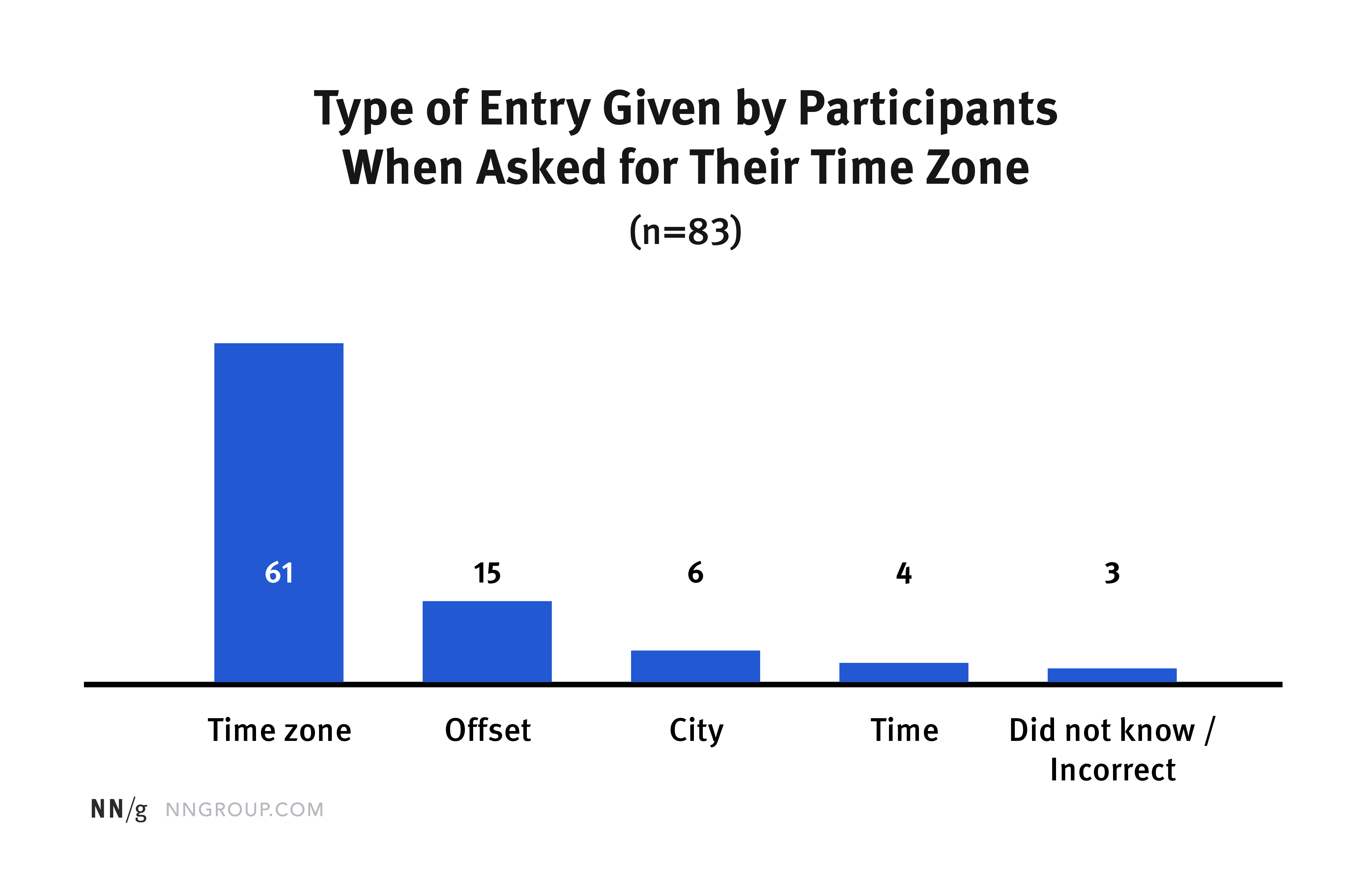 大多數使用者知道自己的時區:在我們研究的 83 名參與者中,73% 能夠準確寫出自己所在的時區(如“太平洋時間”或“歐洲中部時間”),18% 選擇了偏移量(如“UTC-3”)。
