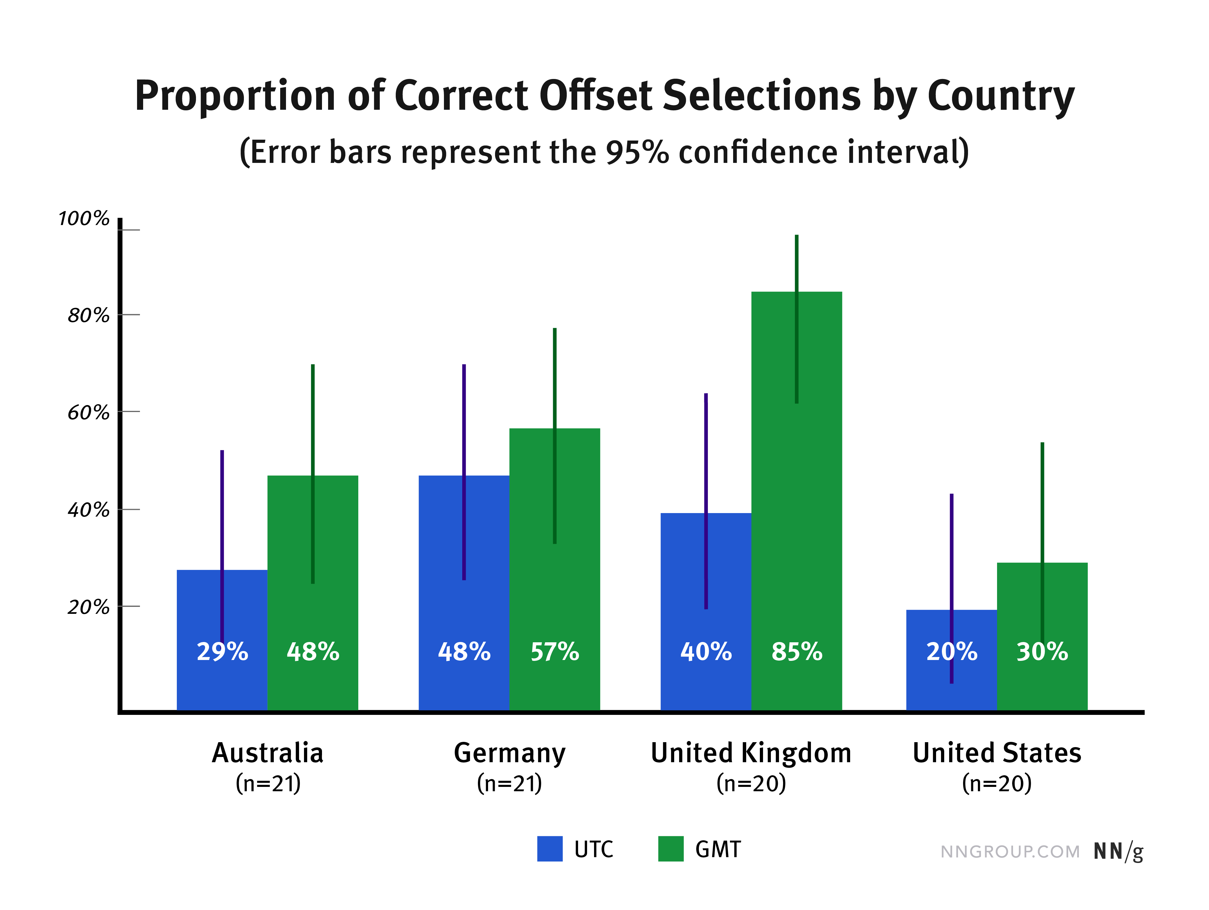 GMT 比 UTC 更為熟悉:儘管 UTC 是更標準的時間表示,但使用者對 GMT 的熟悉度更高(尤其是英國使用者)。在我們的研究中,55% 的使用者知道自己的 GMT 偏移量,而只有 34% 的使用者知道 UTC 偏移量。