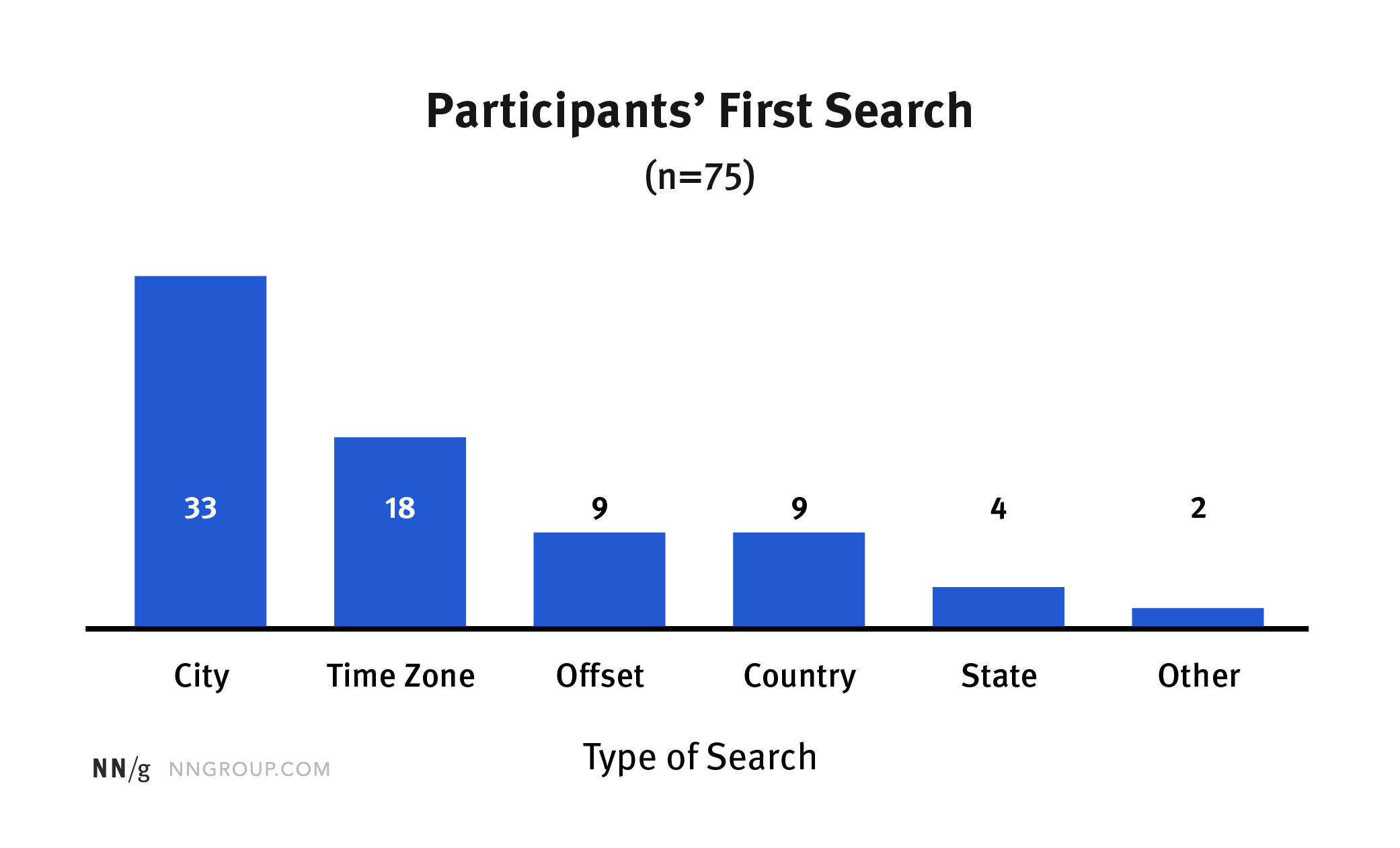 使用者最常搜尋城市名稱:在所有的首次搜尋中,44% 的使用者使用城市作為搜尋詞,而 24% 的使用者使用時區名稱(如“太平洋時間”)作為搜尋詞。這表明允許使用者按城市和時區名稱搜尋有助於提升查詢效率。