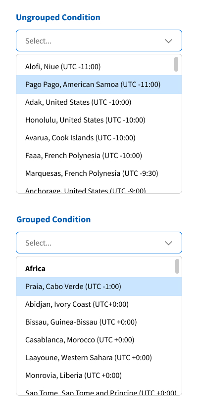 分組有助於提升查詢效率:在我們的測試中,按地區分組的時區列表比單純按偏移量排列的列表更快幫助使用者找到目標時區。尤其對於較長的列表,分組能幫助使用者更快地定位自己所在的區域。
