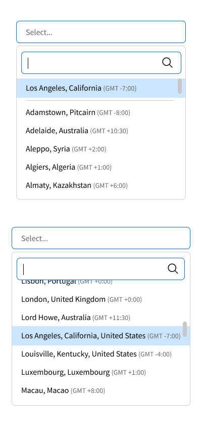 - 提供搜尋功能:在下拉選單中整合搜尋功能,使使用者可以快速查詢時區。確保搜尋欄在下拉選單啟用時可見,提示使用者使用。