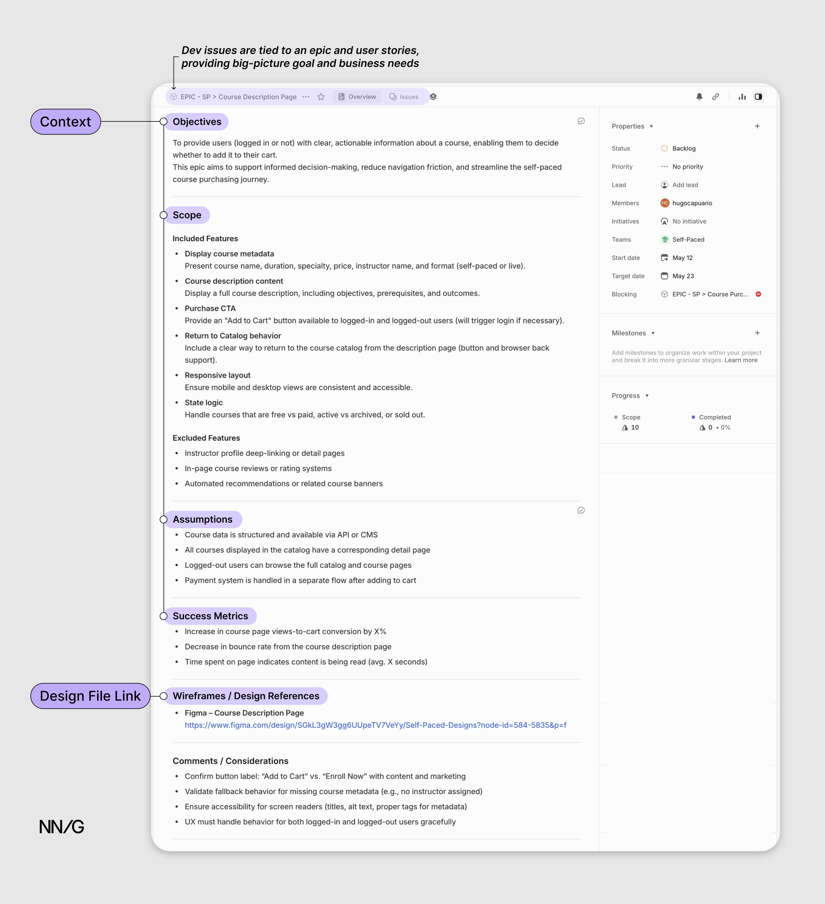 Linear 任務單中整合目標、範圍、假設、成功標準及 Figma 連結,提供開發必要的背景與設計資料。