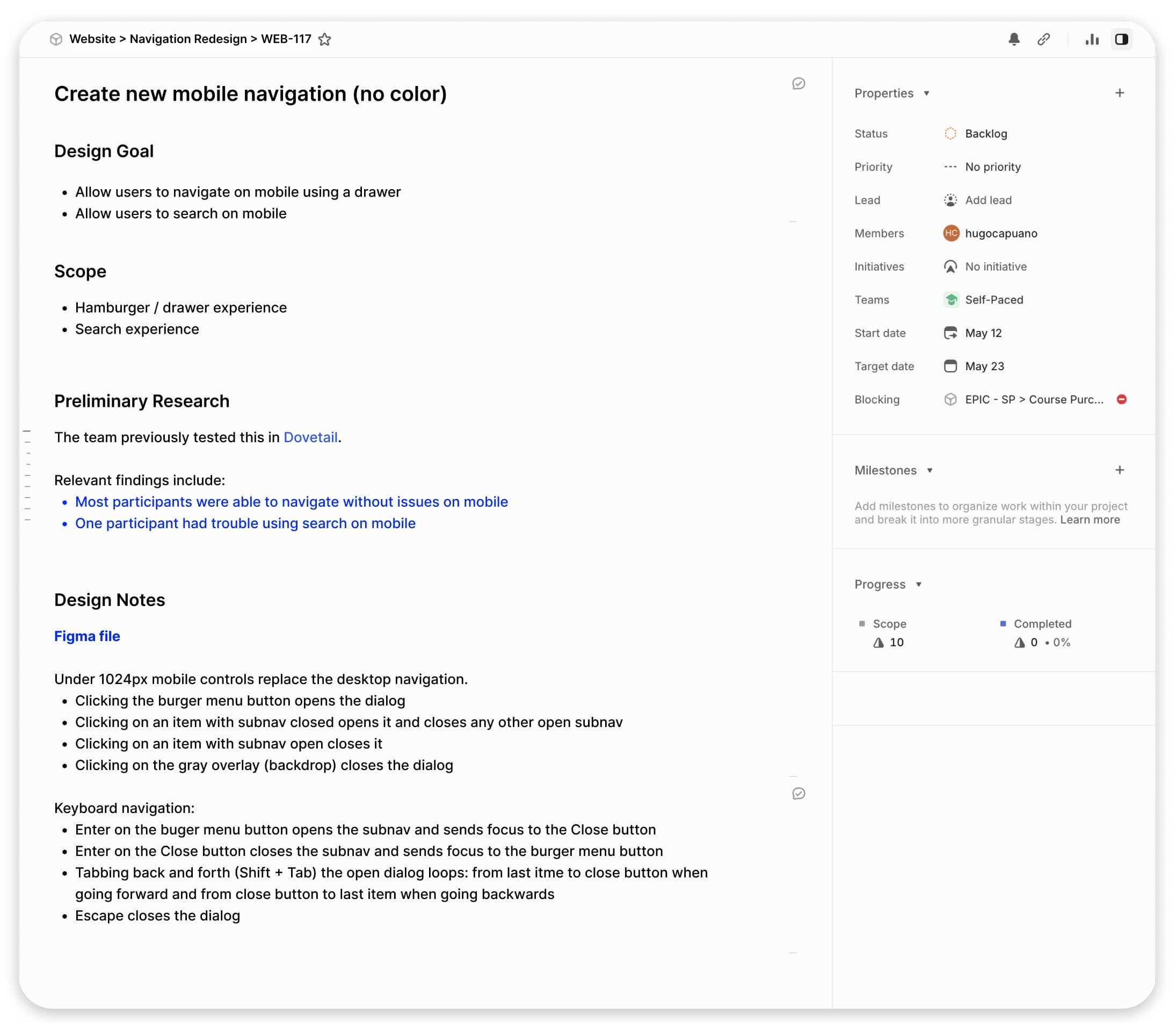 Linear 中說明瞭設計目標、使用者需求、研究發現;