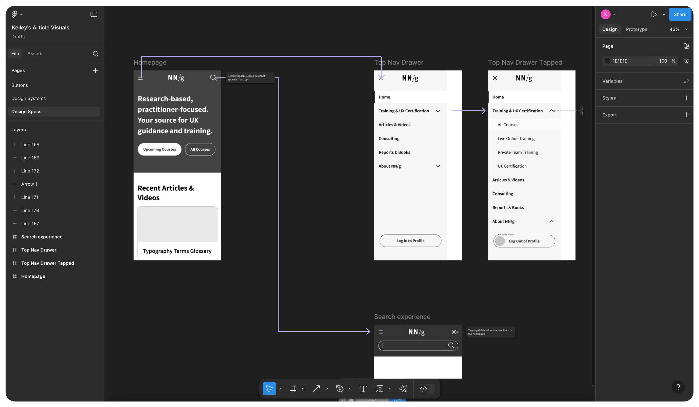 Figma 中有註釋展示不同頁面之間的互動關係。