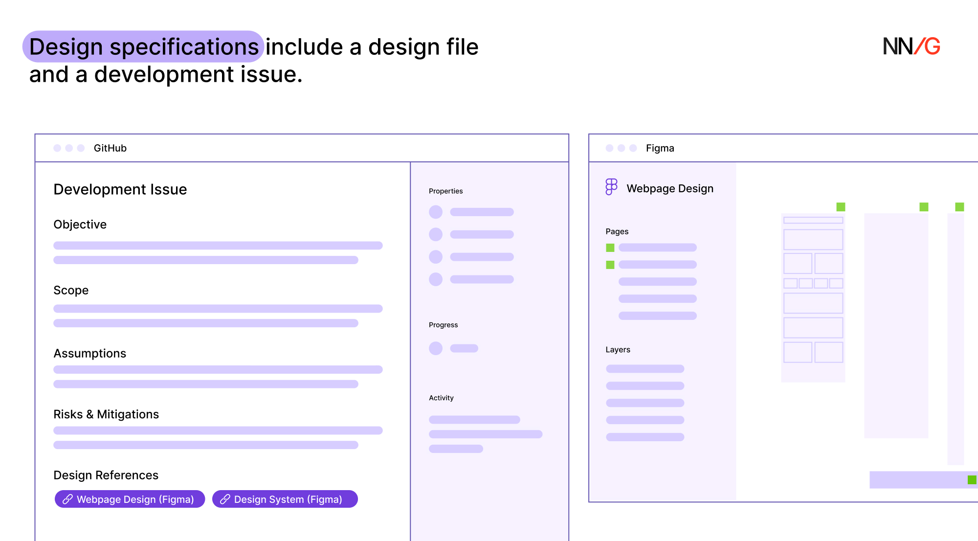 設計規格可以聚焦某一方面,比如僅針對視覺重新整理專案,它可能只包含介面外觀而不涉及功能實現。大多數團隊透過 Figma(或類似設計工具)連結和開發工具(如 GitHub 或 Linear)中的任務單一起傳達設計細節。