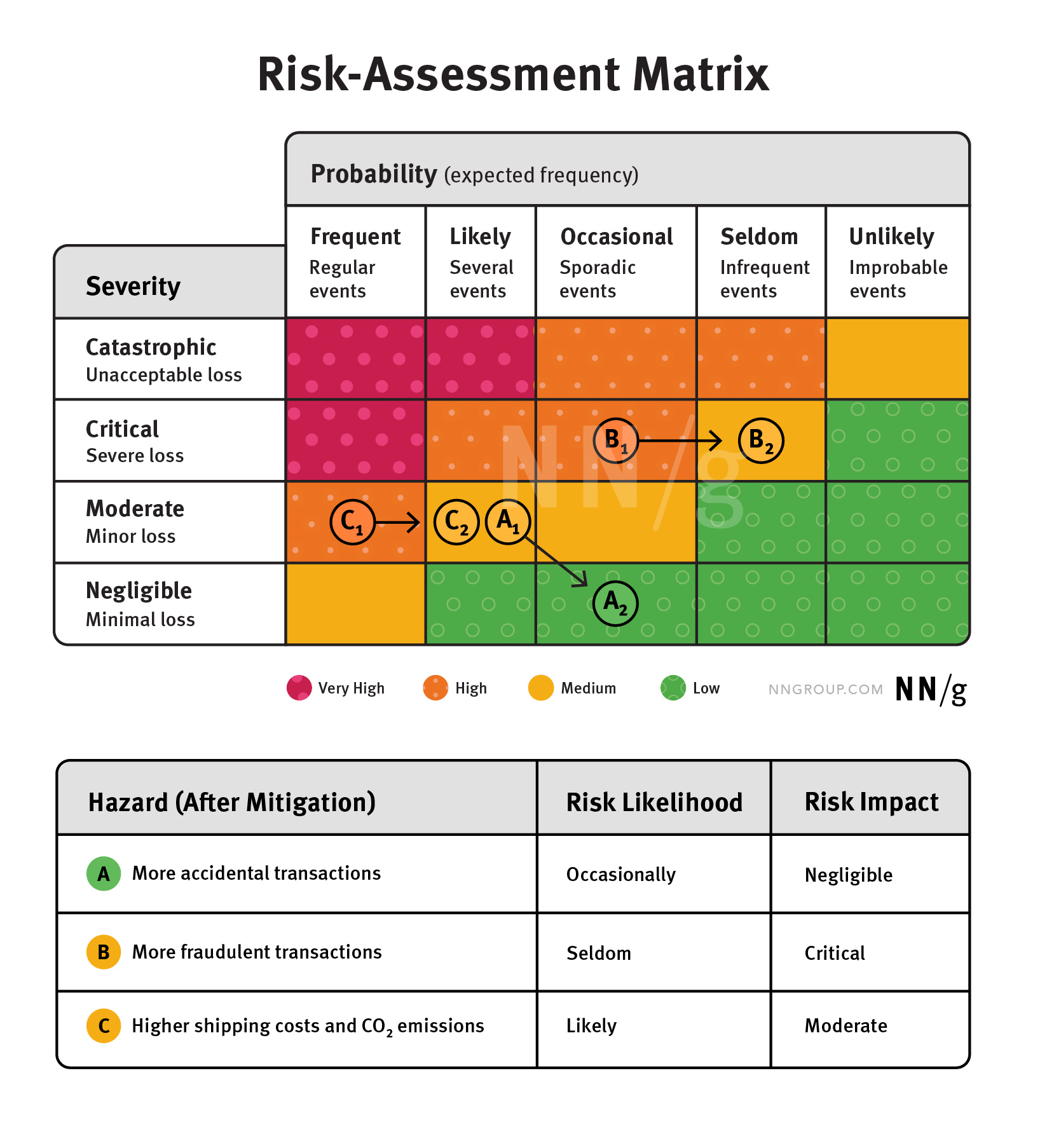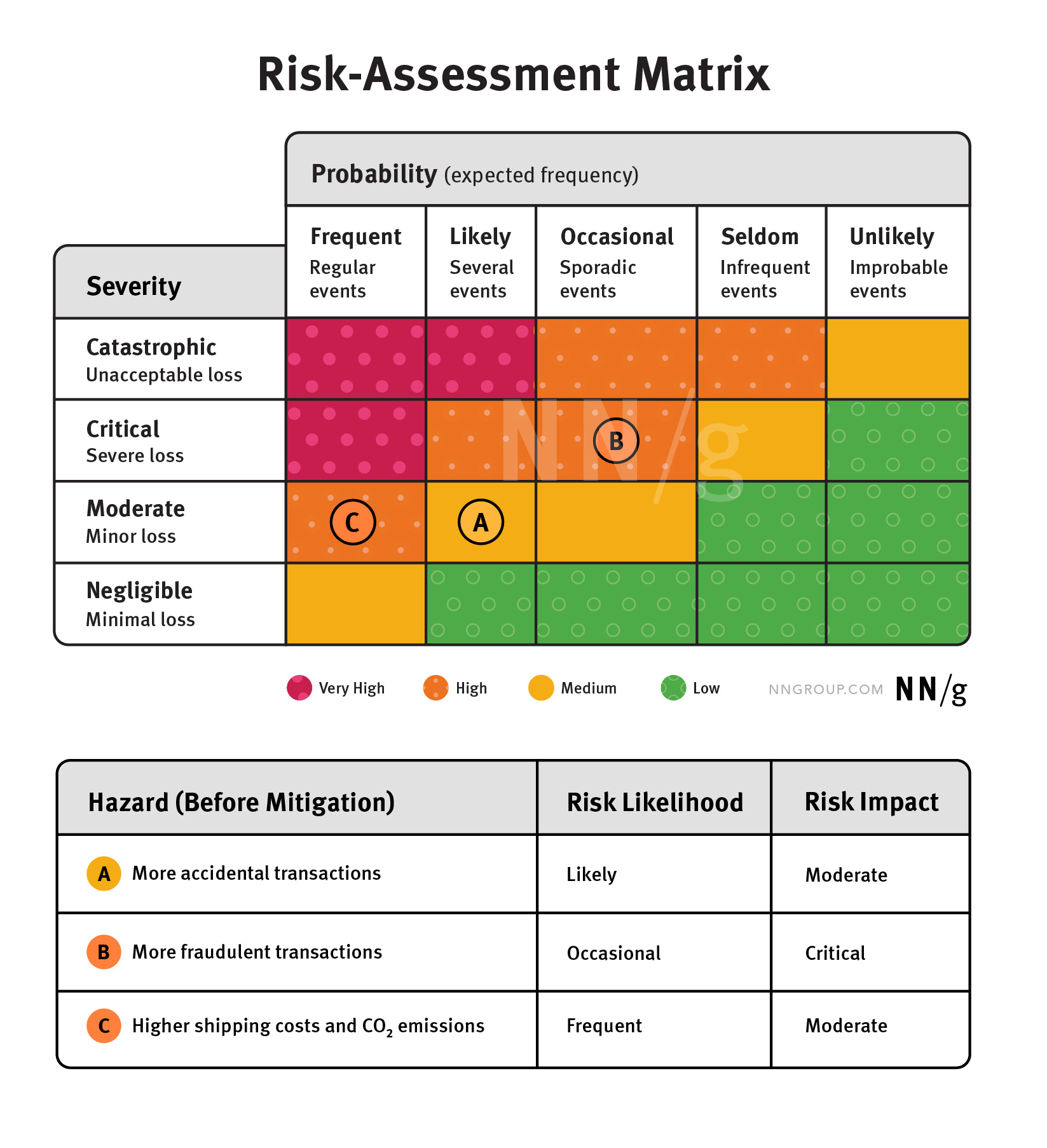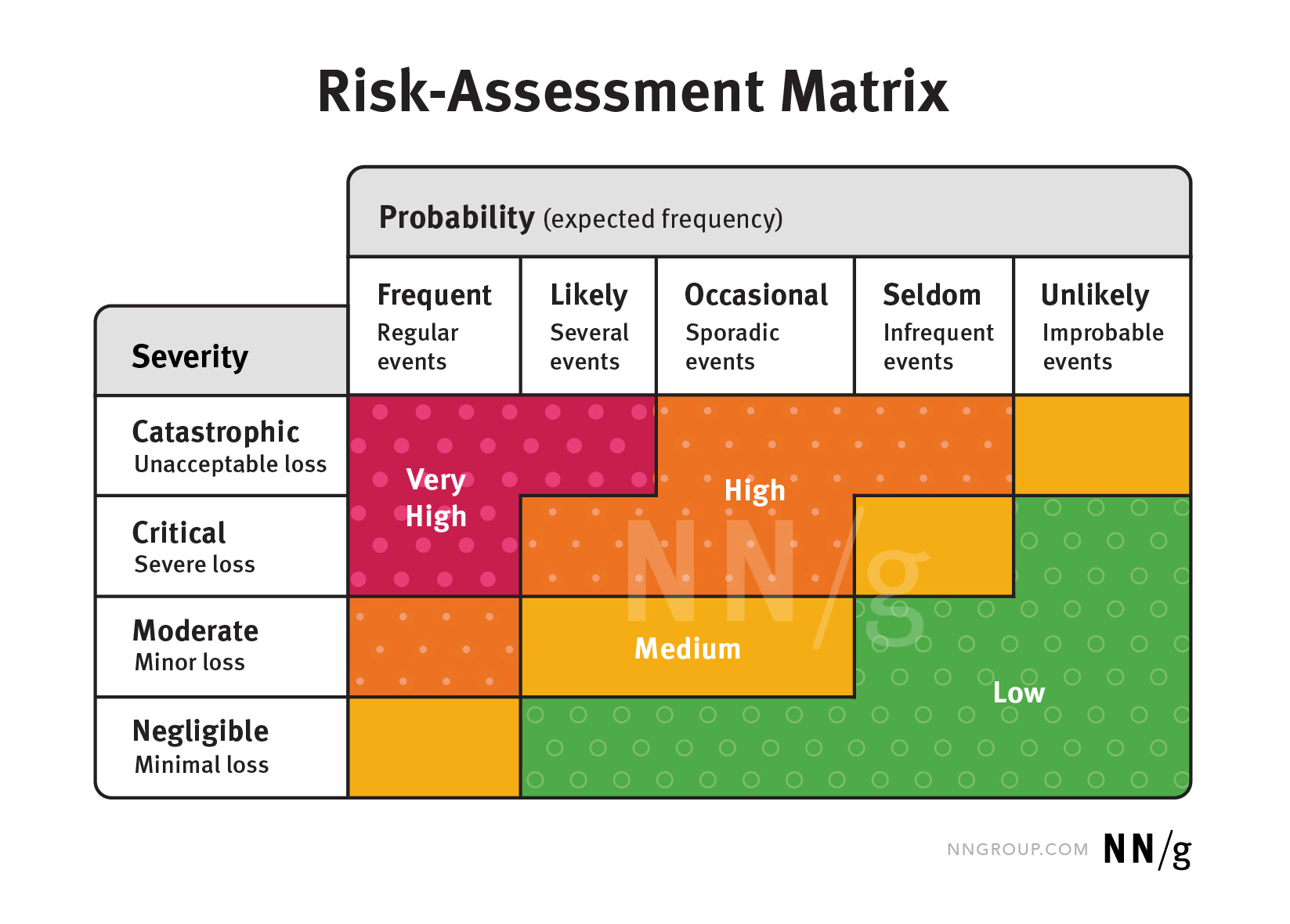 風險是指潛在事件發生的機率和影響程度的組合。團隊可以使用風險評估矩陣,根據事件的嚴重性和發生頻率來“標繪”風險大小,以評估其嚴重程度及控制優先順序。
