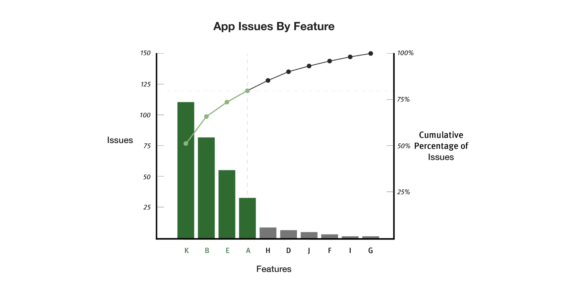 某應用程式的客戶滿意度(CSAT)評分下降,使用者反饋存在大量Bug影響體驗。透過分析Bug追蹤和支援工單資料,發現80%的Bug集中在4個主要功能上,其他功能的問題對整體體驗影響較小。