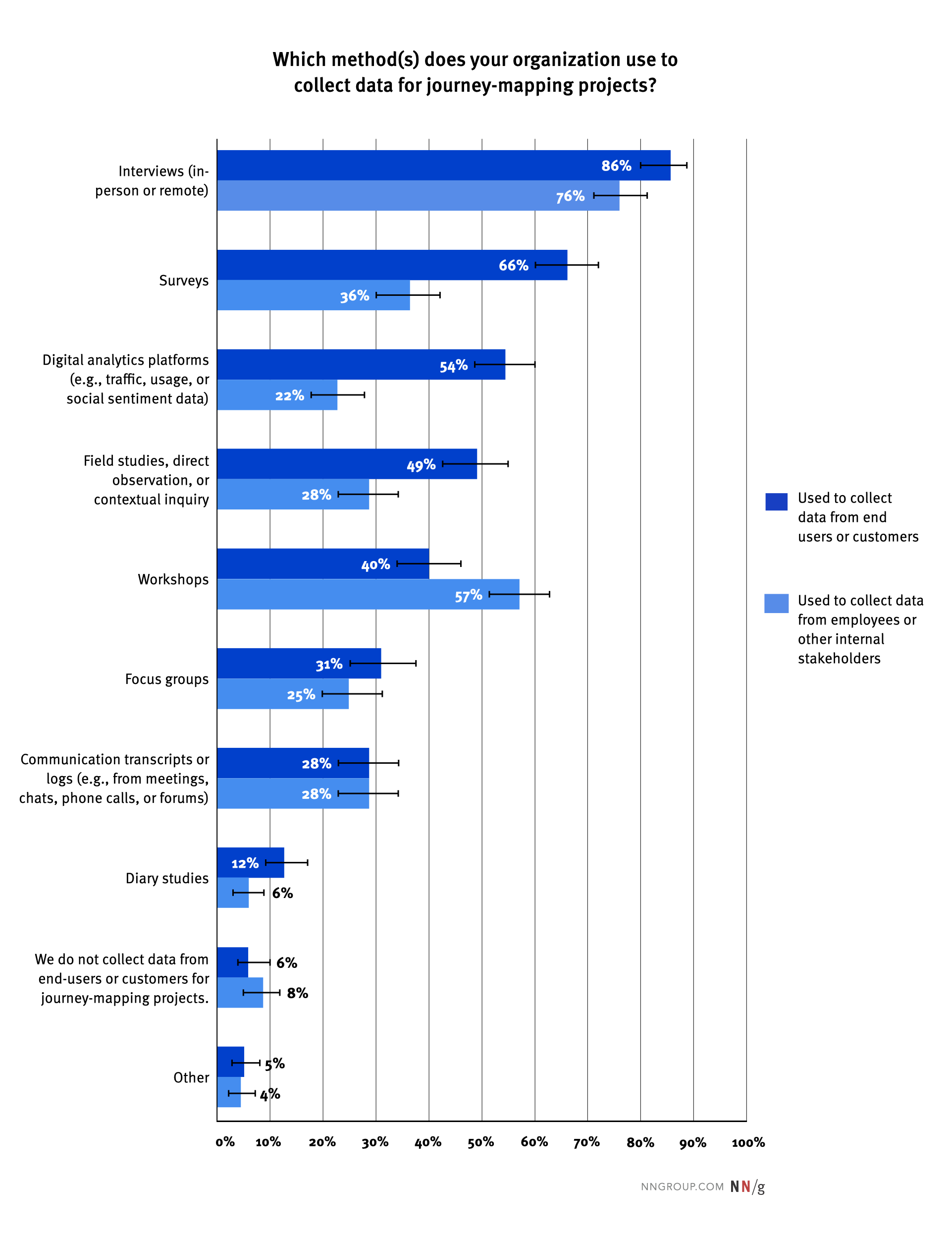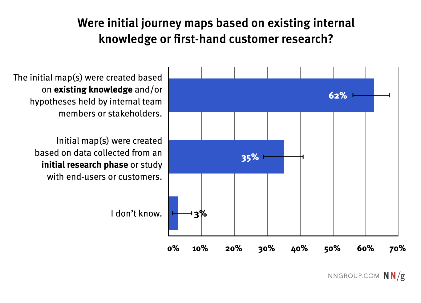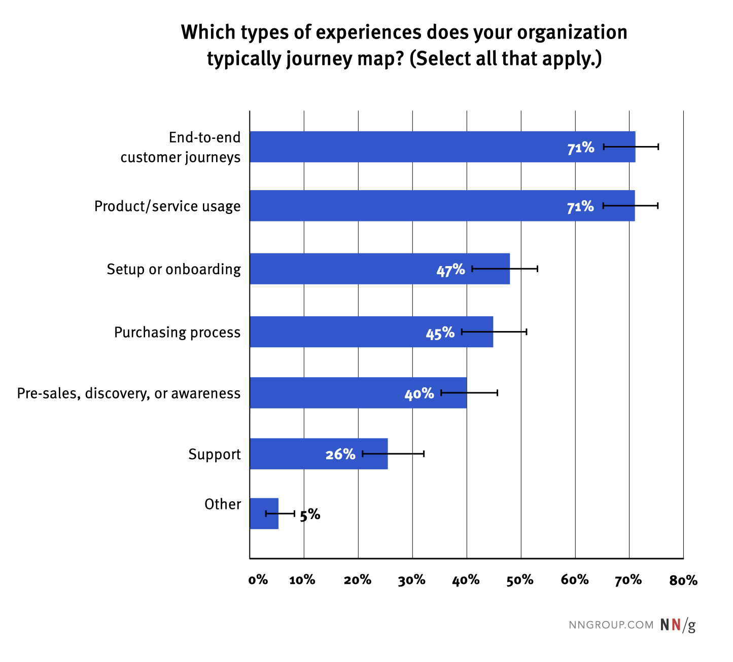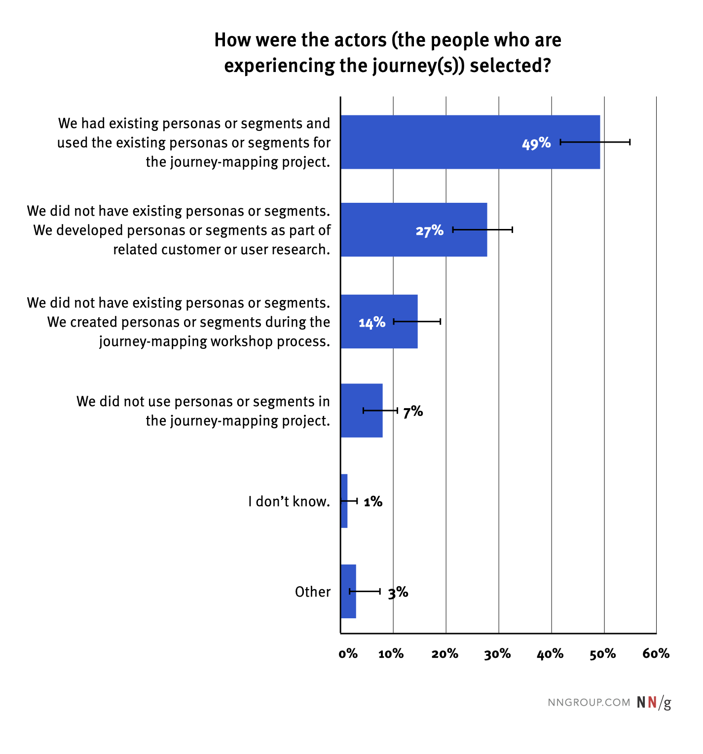大多數從業者報告稱依靠現有的使用者角色來建立他們的旅程圖(誤差線代表 95%置信區間。)