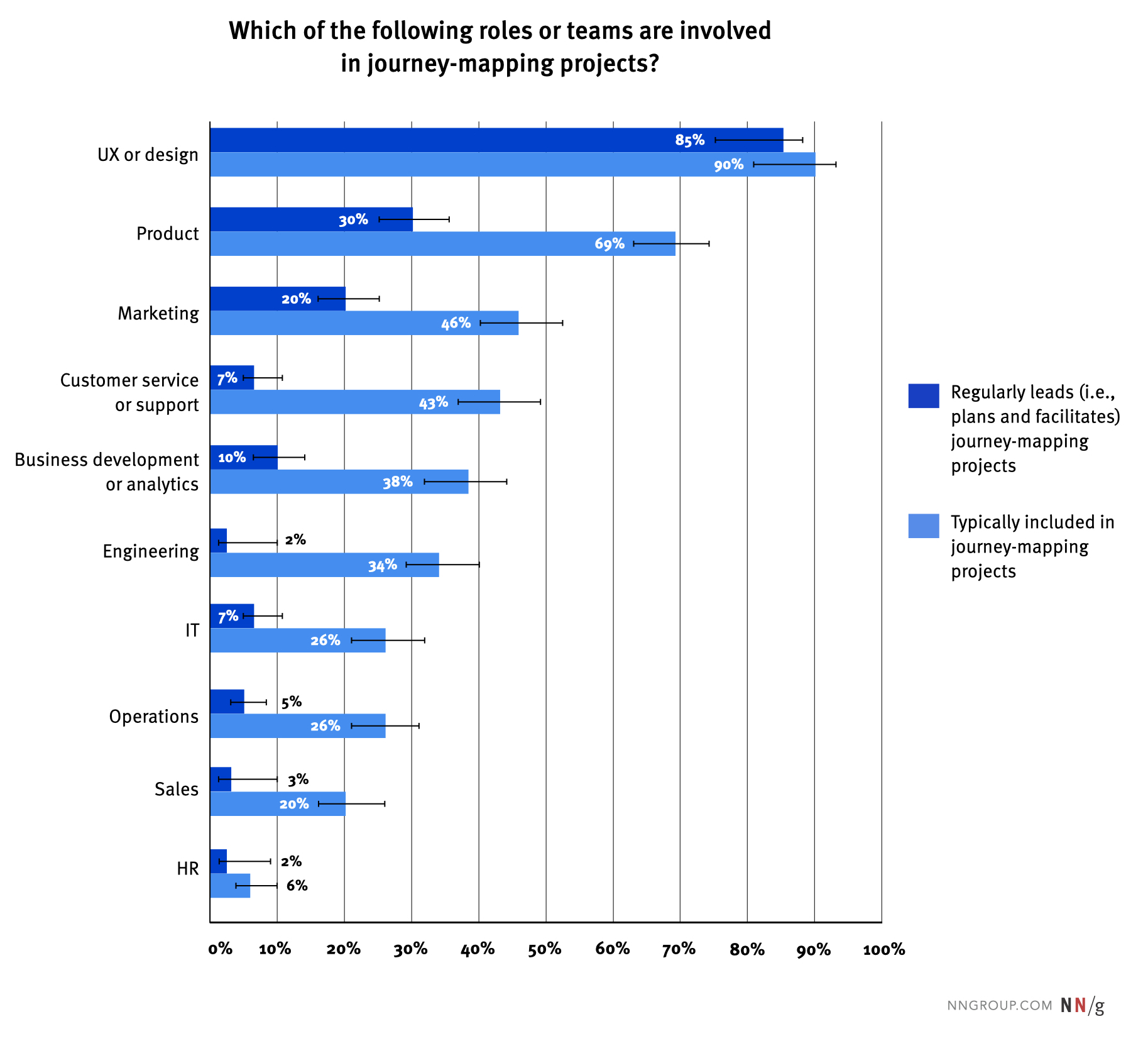 UX或設計角色通常負責或參與使用者旅程對映。調研顯示,旅程圖的建立通常涉及跨學科角色,包括產品、市場和客戶服務或支援部門,參與率分別為70%、46%和42%。團隊協作有助於共享知識並深入理解使用者痛點和機會。