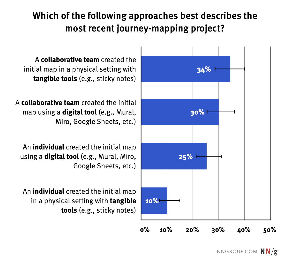 64%的實踐者報告了協同創作,34%使用物理工具(如便籤和紙張),30%使用數字工具(如Miro、Mural或Google Sheets),而36%的實踐者獨立建立旅程圖。