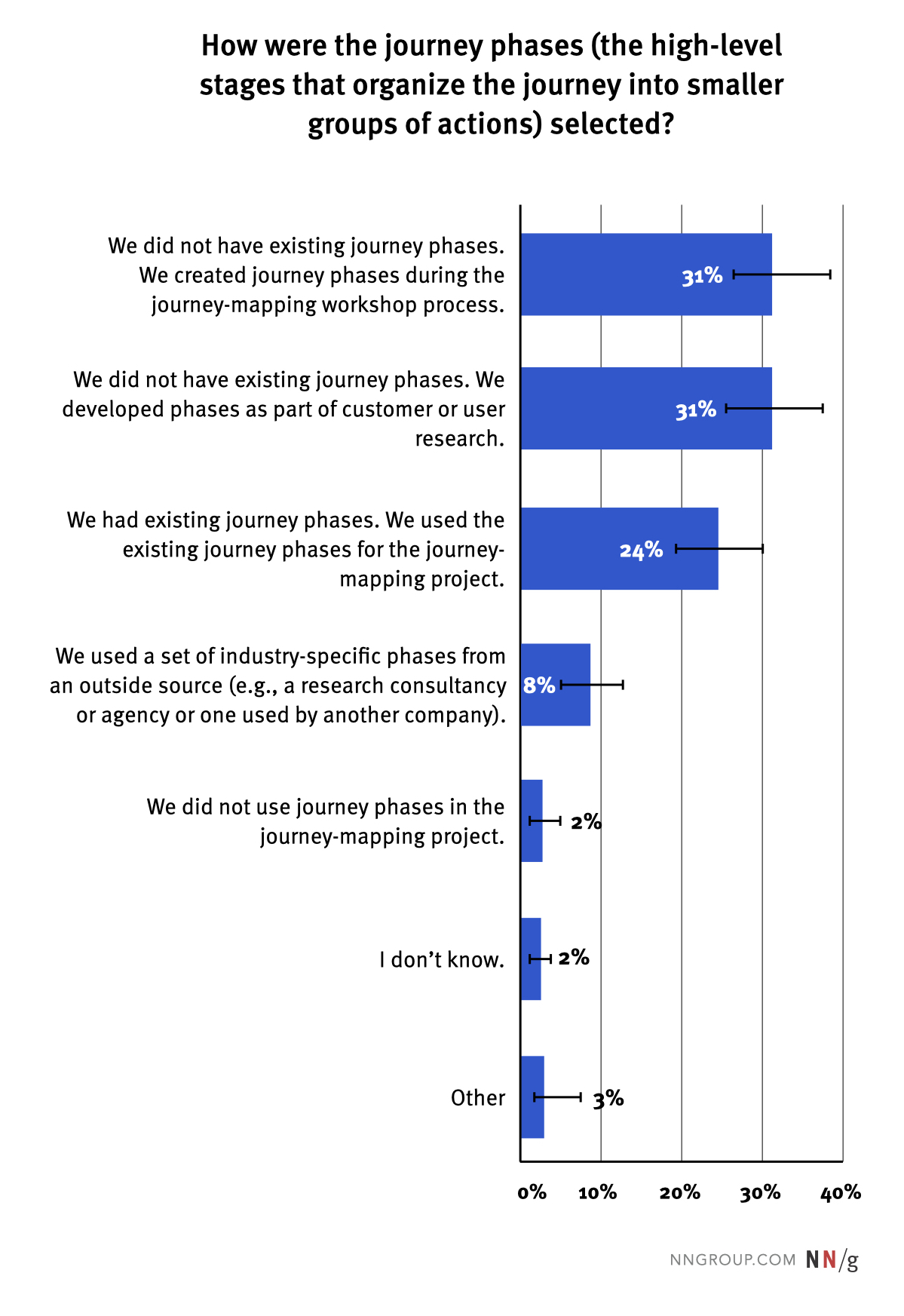 - 旅程階段:描述旅程子目標,幫助組織圖中使用者的行為、想法和情緒。與角色不同,受訪者通常未在旅程對映初期識別階段,而是在使用者研究(31%)或研討會(31%)中確定這些階段。