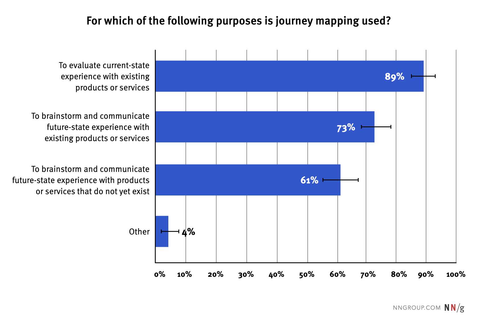 使用者旅程圖可用於評估和最佳化現有產品或服務,也可用於構想未來的理想體驗。調研顯示,實踐者多用旅程圖探索現有產品和服務的當前狀態(89%)或設想其最佳化後的未來狀態(73%)。此外,61%的實踐者表示他們也用旅程圖構思潛在的新產品或服務的未來體驗。