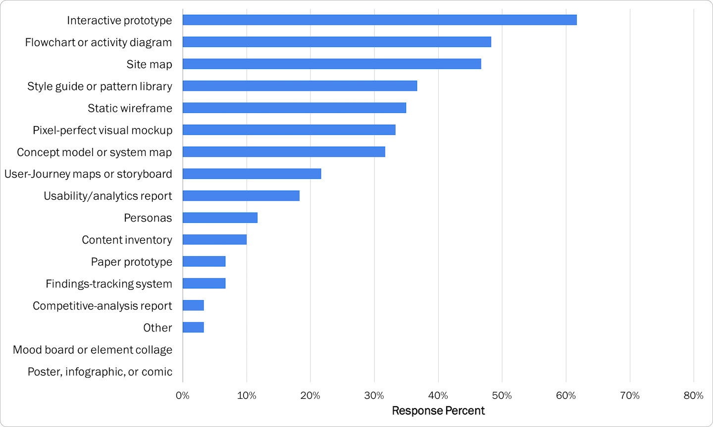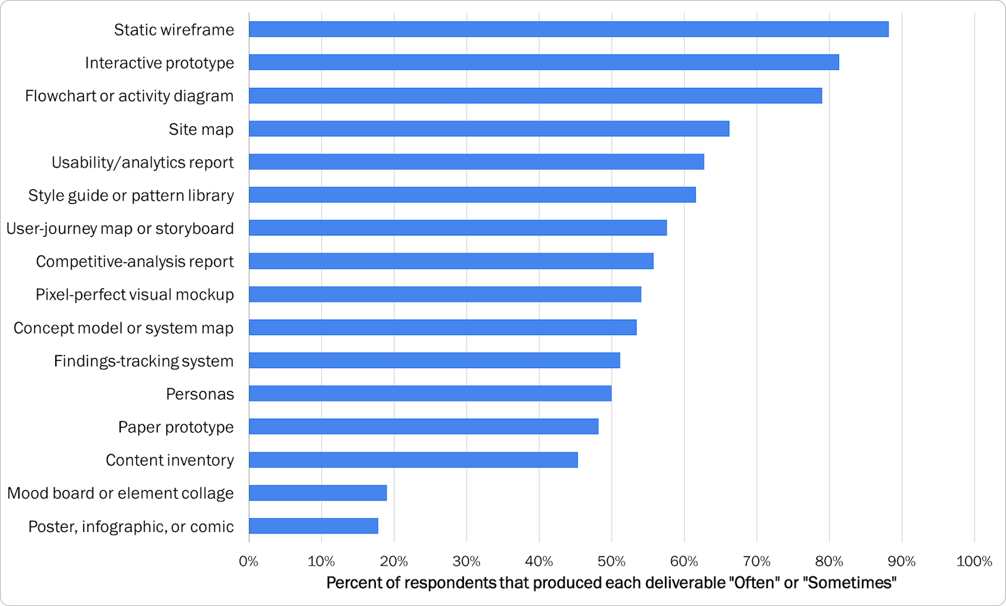 我們對86位UX專業人士的調研顯示,以下是最常建立的交付物型別及使用頻率: