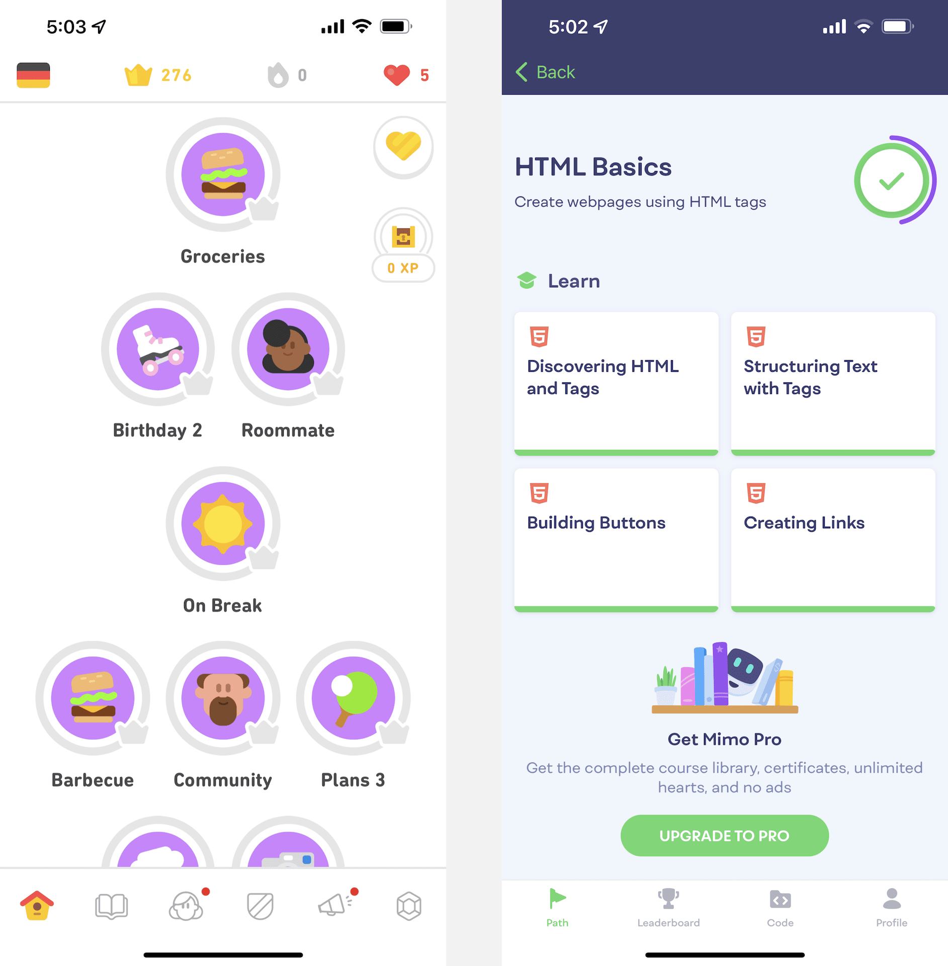 良好設計:Duolingo和Mimo透過使用者自定義學習路徑來支援自主性。