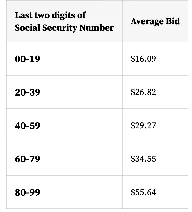 - SSN 後兩位數較低的參與者(比如 00–19)提出的最高價格很低,比如 $16.09。