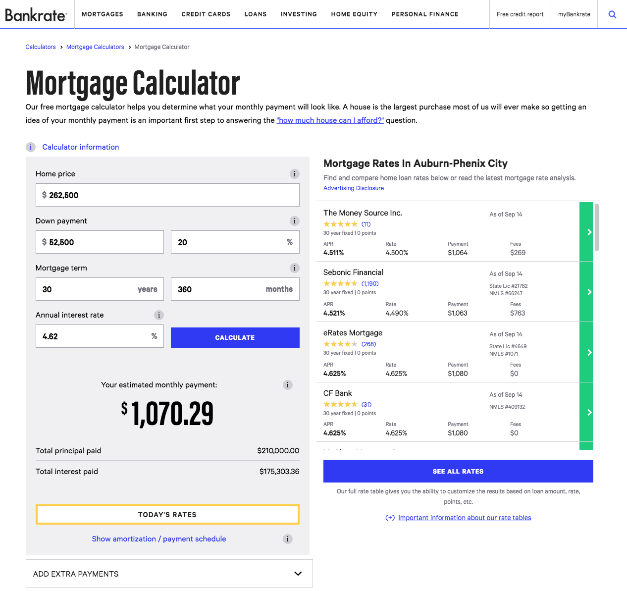 房貸計算器:Bankrate.com 提供符合典型使用者預期的預設值,讓使用者更容易設定貸款引數。